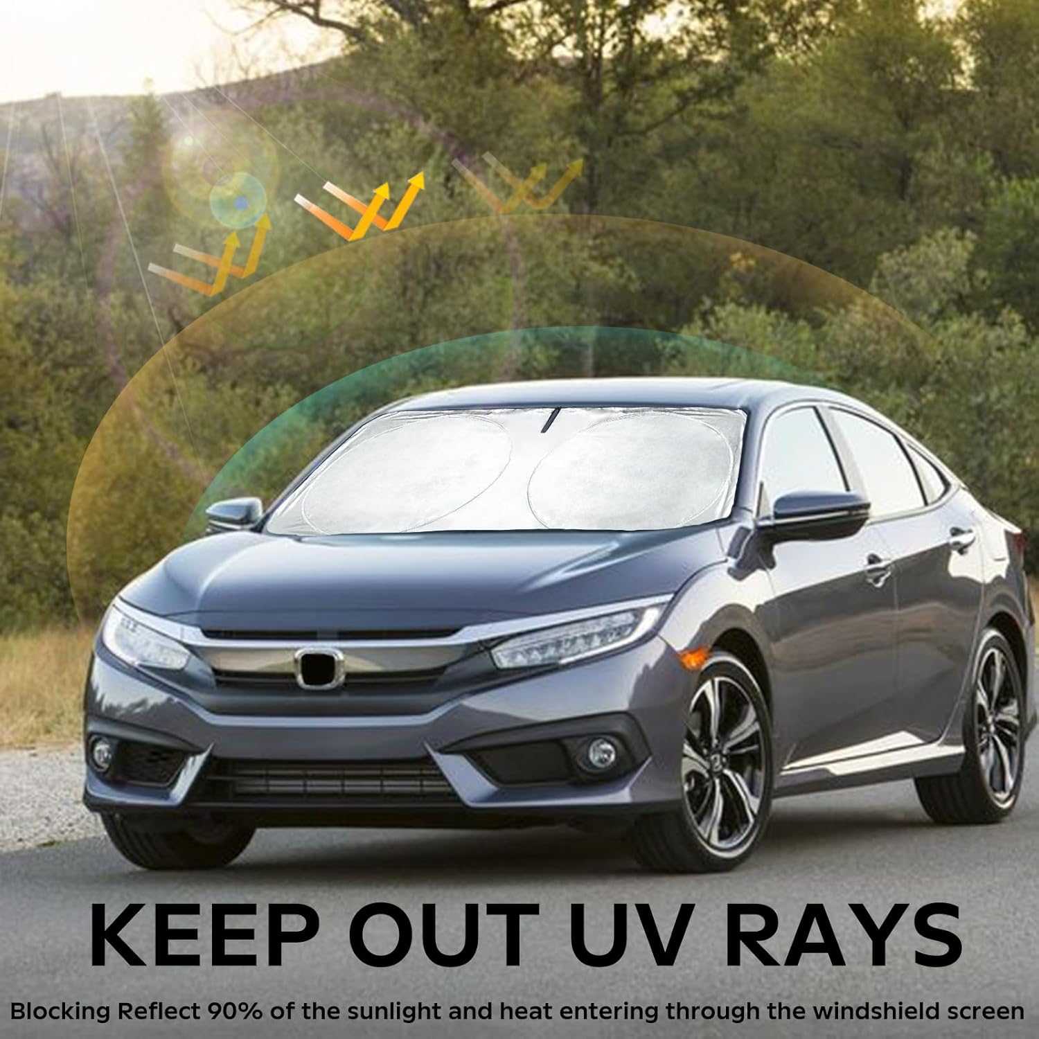 - [Block UV Shield Protector]Fit for Honda civic sunshade it is made of 210T polyester fabric with UV reflective material, two -layer heat insulation and 99% SPF, which can avoid the spicy sunshine in summer. it can be fully shaded and no need to worry the high temperature in summer. must have for honda a-ccord accessories. Constructed with double layers of heat shield fabric, this windshield visor sun shade acts as a barrier against the sun's intense rays, keeping your car cool during hot summer days.