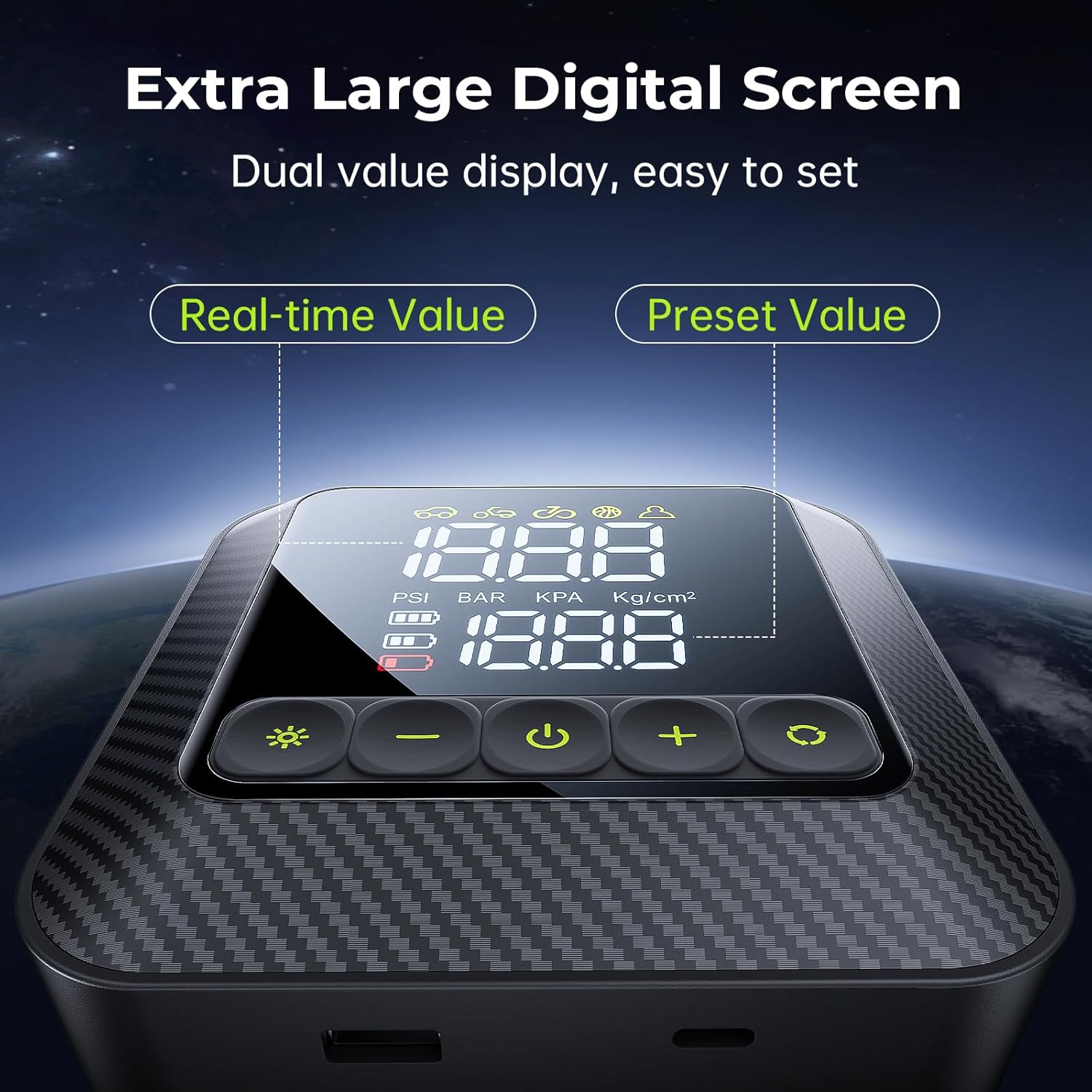 - Super-Fast Inflator with Extreme Precision: Inflates up to 3 times faster than competitors, with a rated pressure of up to 150 PSI and a 7800mAh battery, ideal for car tires, bikes, motorcycles, and balls