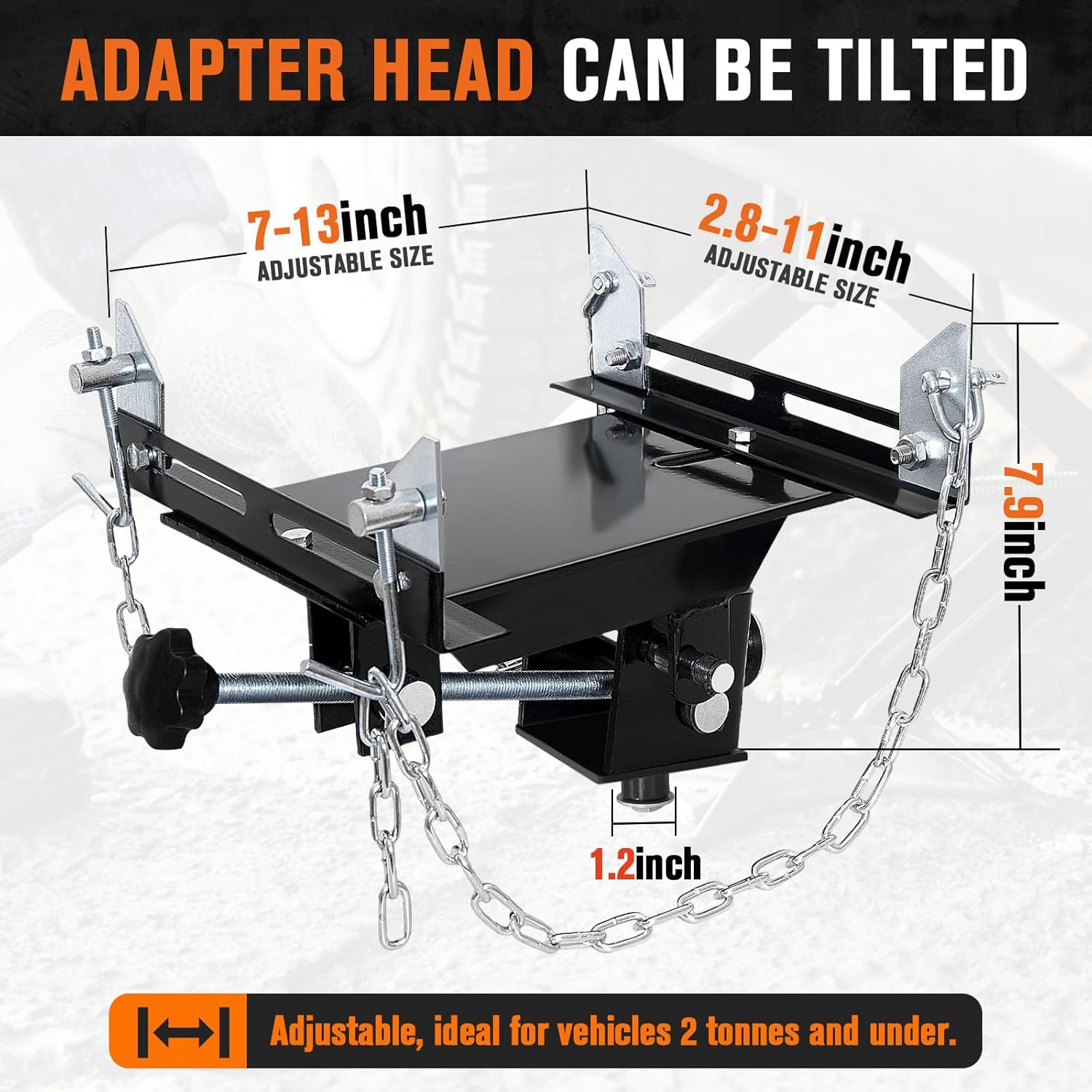 - Jack adapter head tilts 30° forward and 30° backward allowing multiple adjustments.Double 25" long safety chains of high strength for secured load