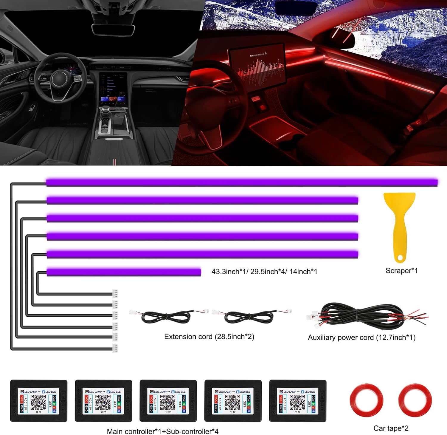 - 【High Bright & Uniform】The Acrylic Car Ambient Interior Lighting have super bright LED and acrylic lens and contains 6 LED strips (4*29.5inch+1*43.3inch+1*14inch), also comes with 1 main controller and 4 sub controllers,and can be flexibly installed on any car by DIY without disorganized, which is plug and play, and this acrylic light evenly spread over the lamp strip is brighter, more uniform and softer than other optical fiber lamps that rely on only one LED.