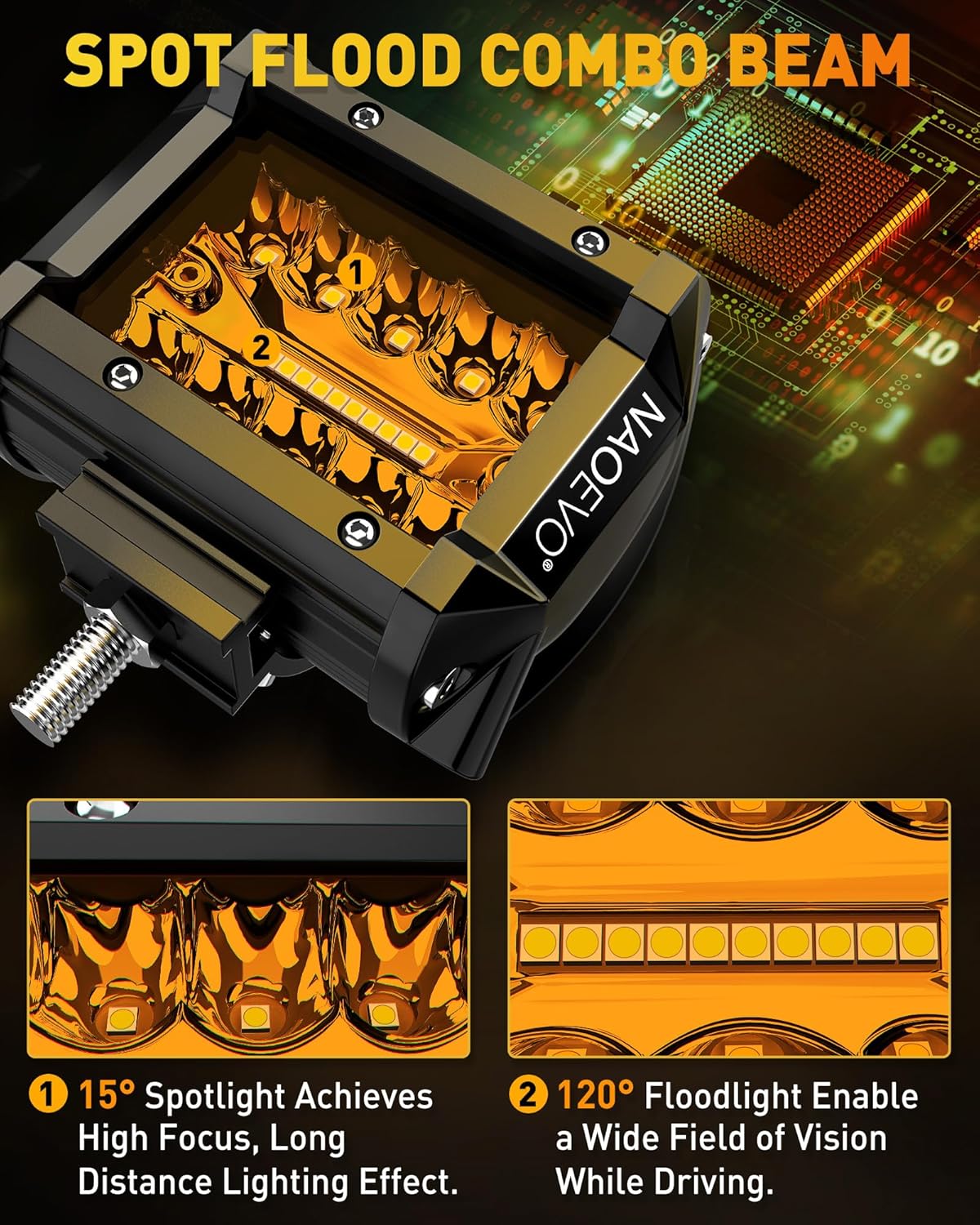 - [Spot Flood Combo LED Light Pods] - NAOEVO 4 inch led pods feature 15° spotlight beam to provide high-focus, long-range visibility, while the 120° floodlight beam provides broader coverage. The powerful combo provides a stronger lighting effect than other single-function led lights, catering to a range of lighting demands.