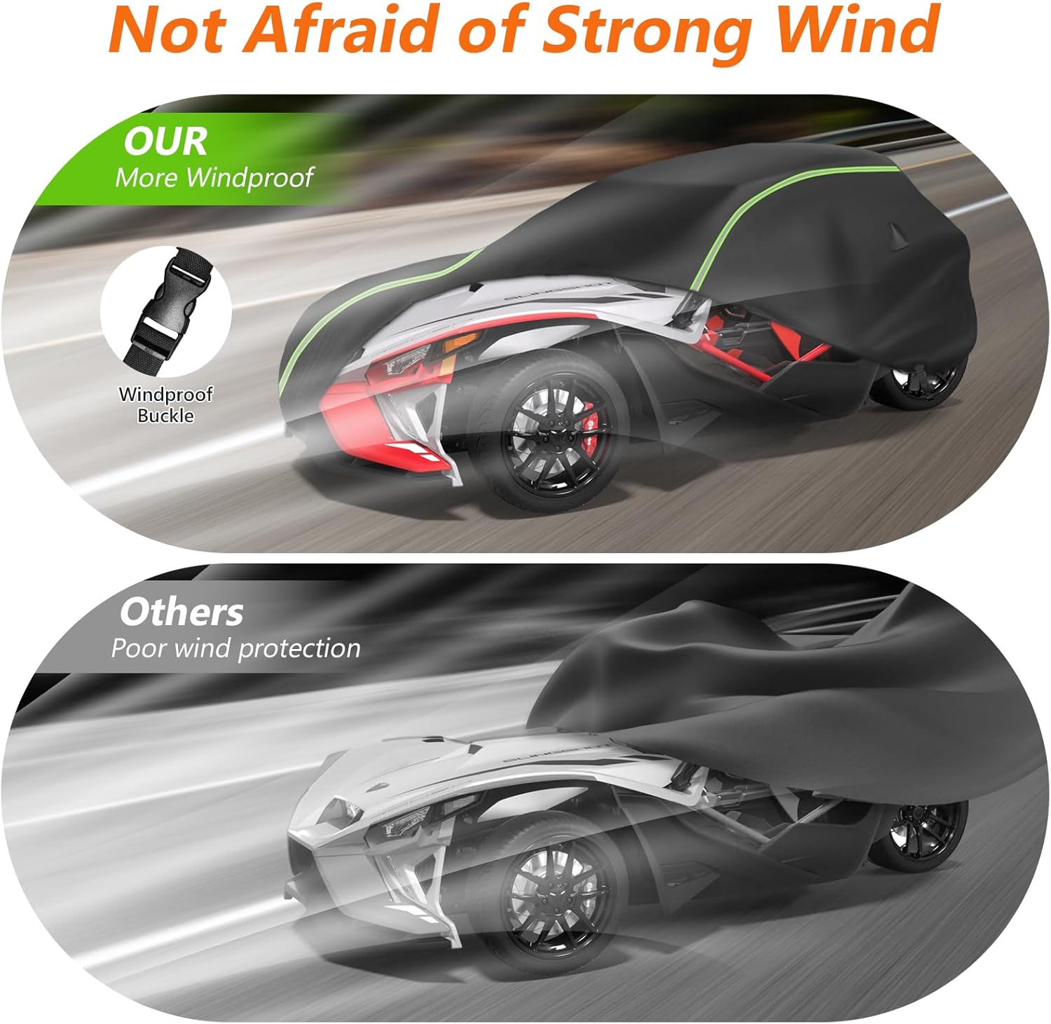 - Advanced Windproof: The cockpit cover is designed with an adjustable elastic cord at the bottom, which allows it to adjust easily to the size. There are 2 adjustable straps and buckles, and an adjustable windproof buckle strap at the rear of the car. Safe and windproof even in stormy conditions.
