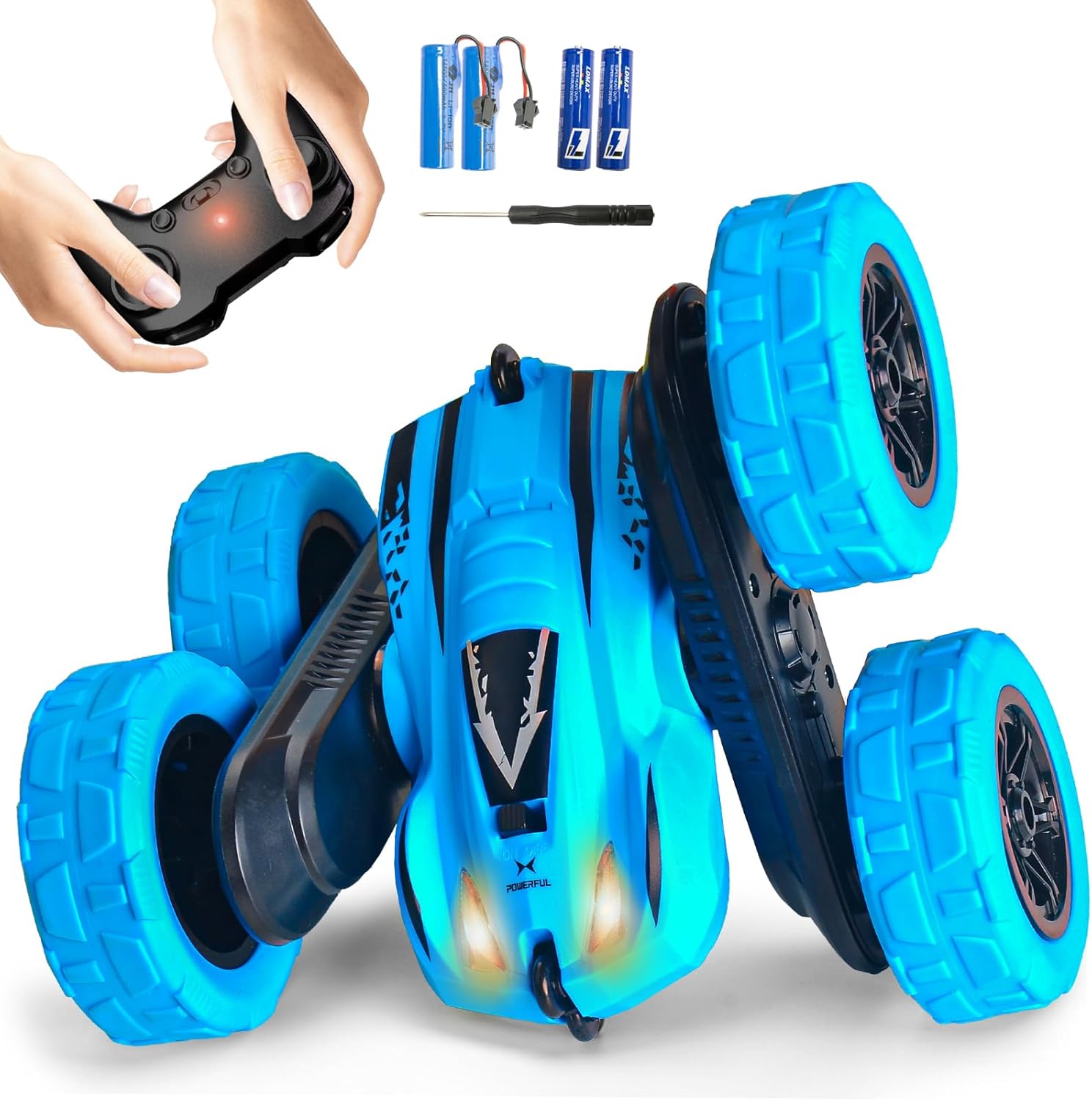 Remote Control Car for 6-12 Year Old Double Sided 360°Rotating 4WD RC Cars with Headlights 2.4GHz Rechargeable Electric Stunt Race Car Toy for Boys Girls Birthday Gifts(Blue)
