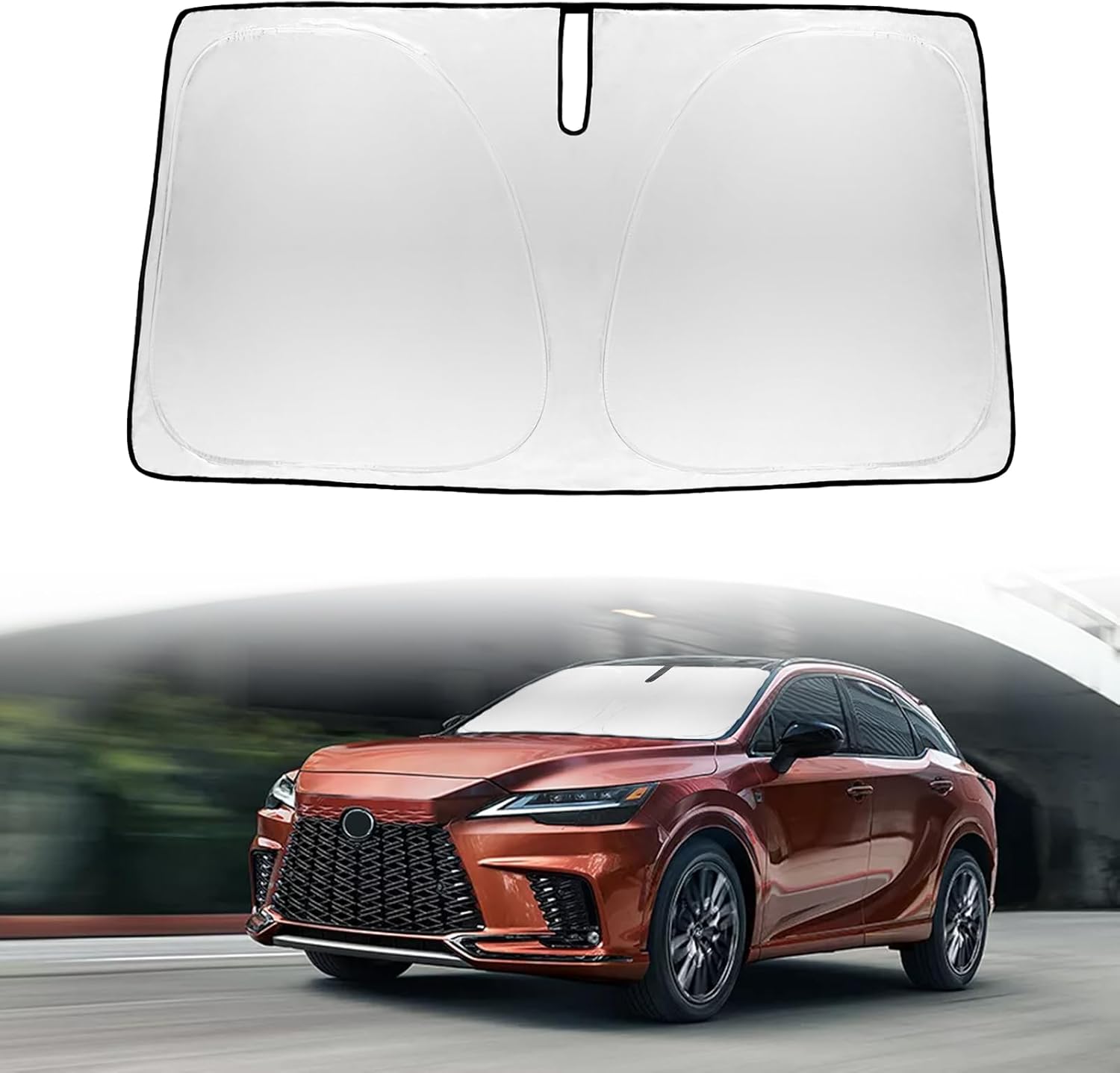- ☀︎【Vehicle Specific】Front windshield sun shade fits perfectly for Lexus RX RX350 RX330 RX300 RX450 RX450h RX450hl 2023-2026 Series. Precise fit design and Reinforced steel rings make enough to make the shade fit precisely to the window, no need to use suction cups to hold it in place. Full covered your windshield,No Gap,100% Perfect fit. Its custom cut design and reinforced steel rings ensure a secure fit well.