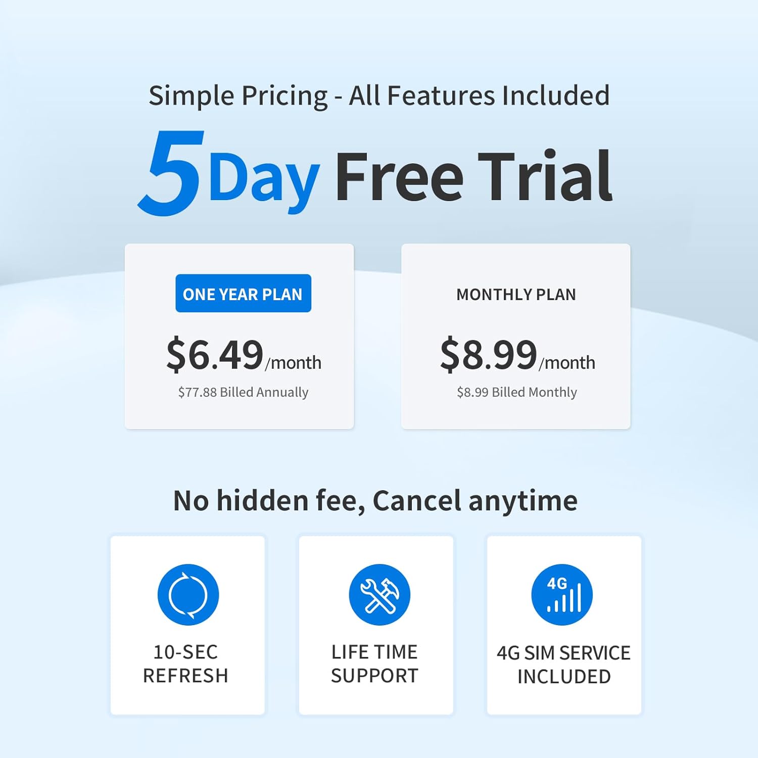 - 【5-day Free Trial】After the trial, continue for just $6.49/month with a 1-year plan ($77.88 total) or $8.99 for monthly subscription. SIM & data included.