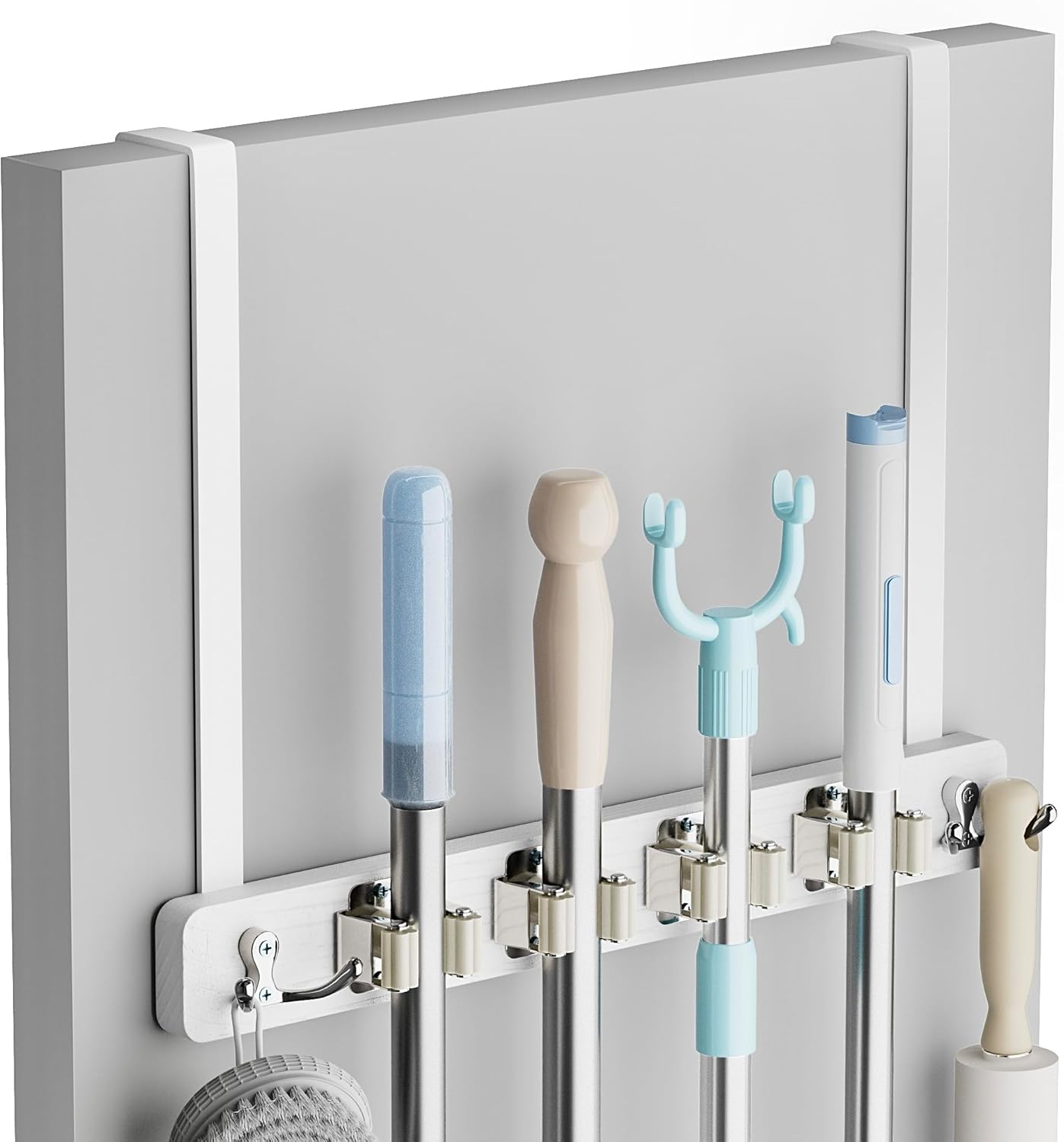 - Wide Range of Uses, Ideal Gift: Step away from traditional broom holder door mount. Simply place door broom holder organizer over the door. Our over the door broom and mop holder maximizes space without compromising style, effortlessly organizing brooms, mops, towels, and brushes in the laundry room, garage, bathroom or kitchen. With its aesthetic appeal and practicality, it's a thoughtful gift for occasions like Father's Day, Mother's Day, or for husband, wife and grandparents.