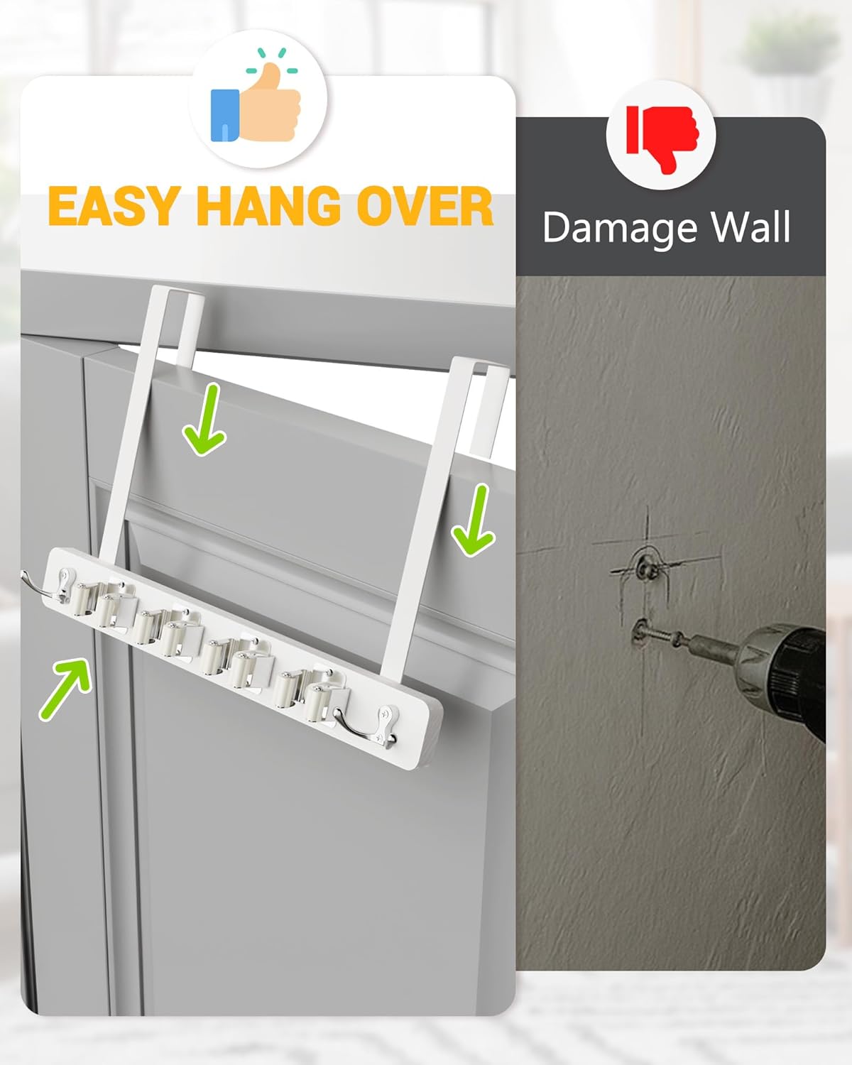 - No Drill, Easy Installation: Installing broom holder door mount is simple and drill-free. Broom holder includes 4 non-scratch pads to protect door from scratches and eliminate "rat-rat" noises, ensuring a peaceful environment. Hooks are 1.9" wide and 0.07" thick, as thin as a penny, fitting most doors. Ideal for renters or anyone who wants to avoid damaging walls, you simply hang it over the door with the included hooks. This method efficiently organizes space without any damage (Patent registration has been approved)