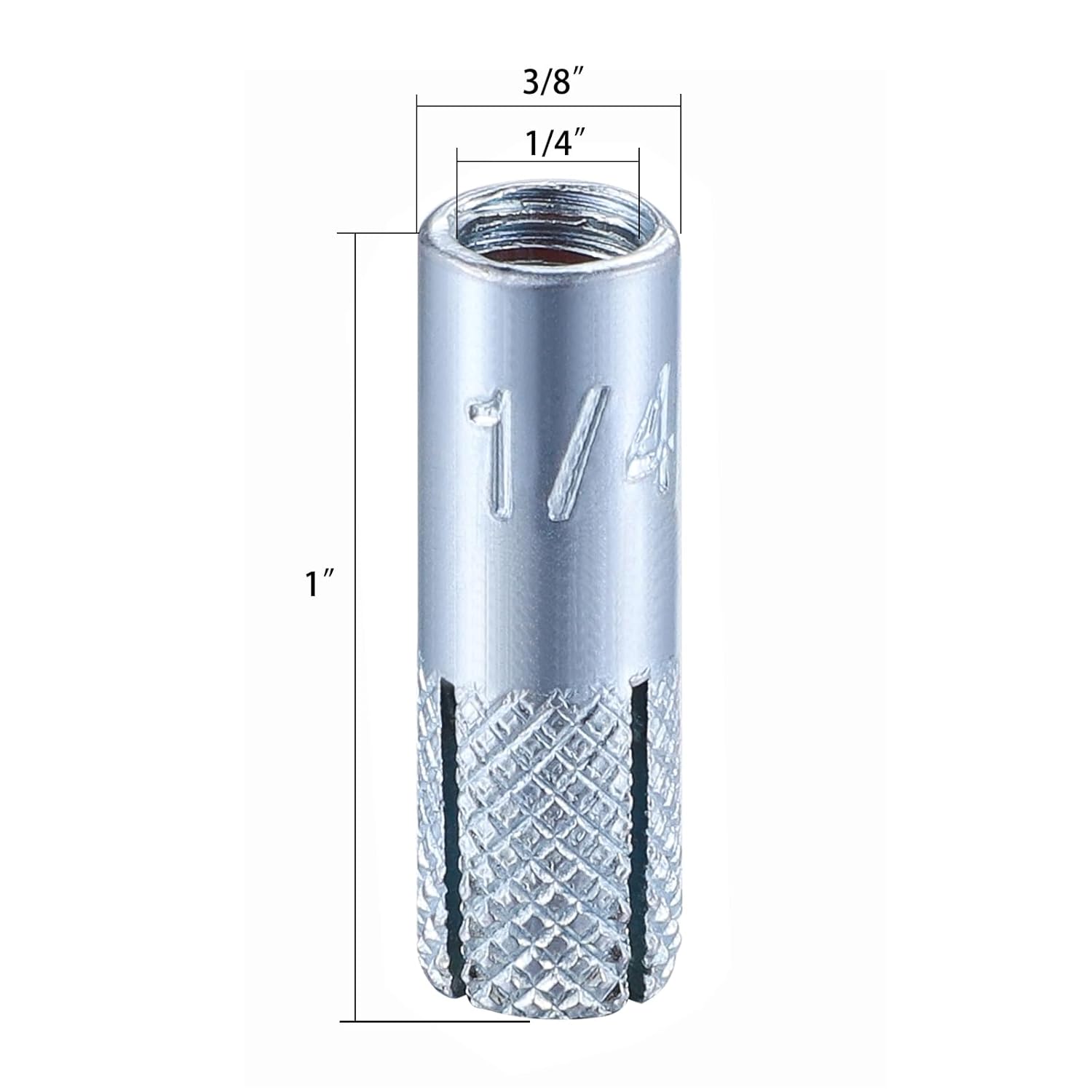 - [Function] 1/4" Inch premium iron material knurled drop in anchors: 1" hole depth and 3/8" hole diameter, use with 1/4-20 bolt.