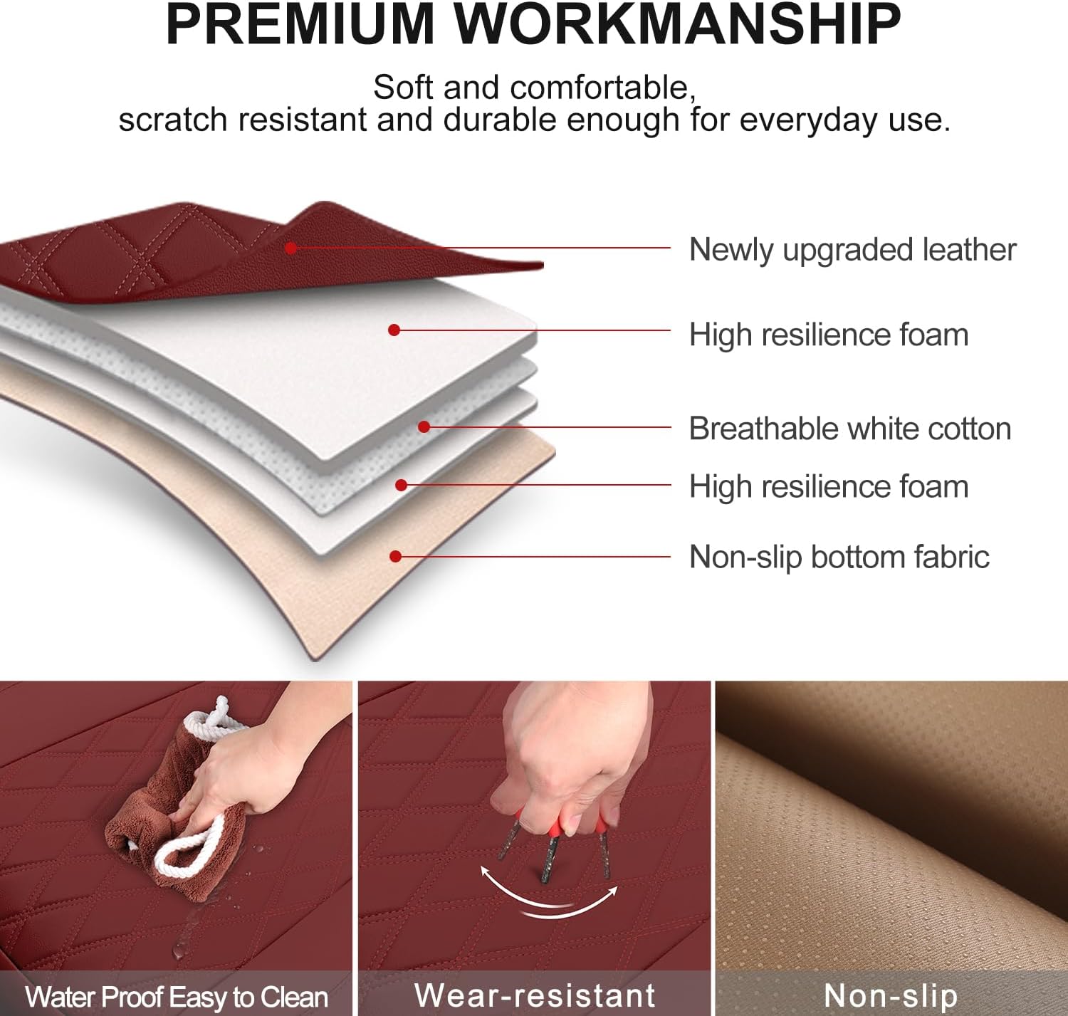 - PU Leather Soft & Durable: Our bottom seat covers for cars are made of soft PU leather, providing soft and durable protection for your car interior for long-term use. A built-in layer of elastic sponge provides maximum comfort for your hips during your driving. When the bottom car seat covers get dirty, just wipe them gently with a dry towel.