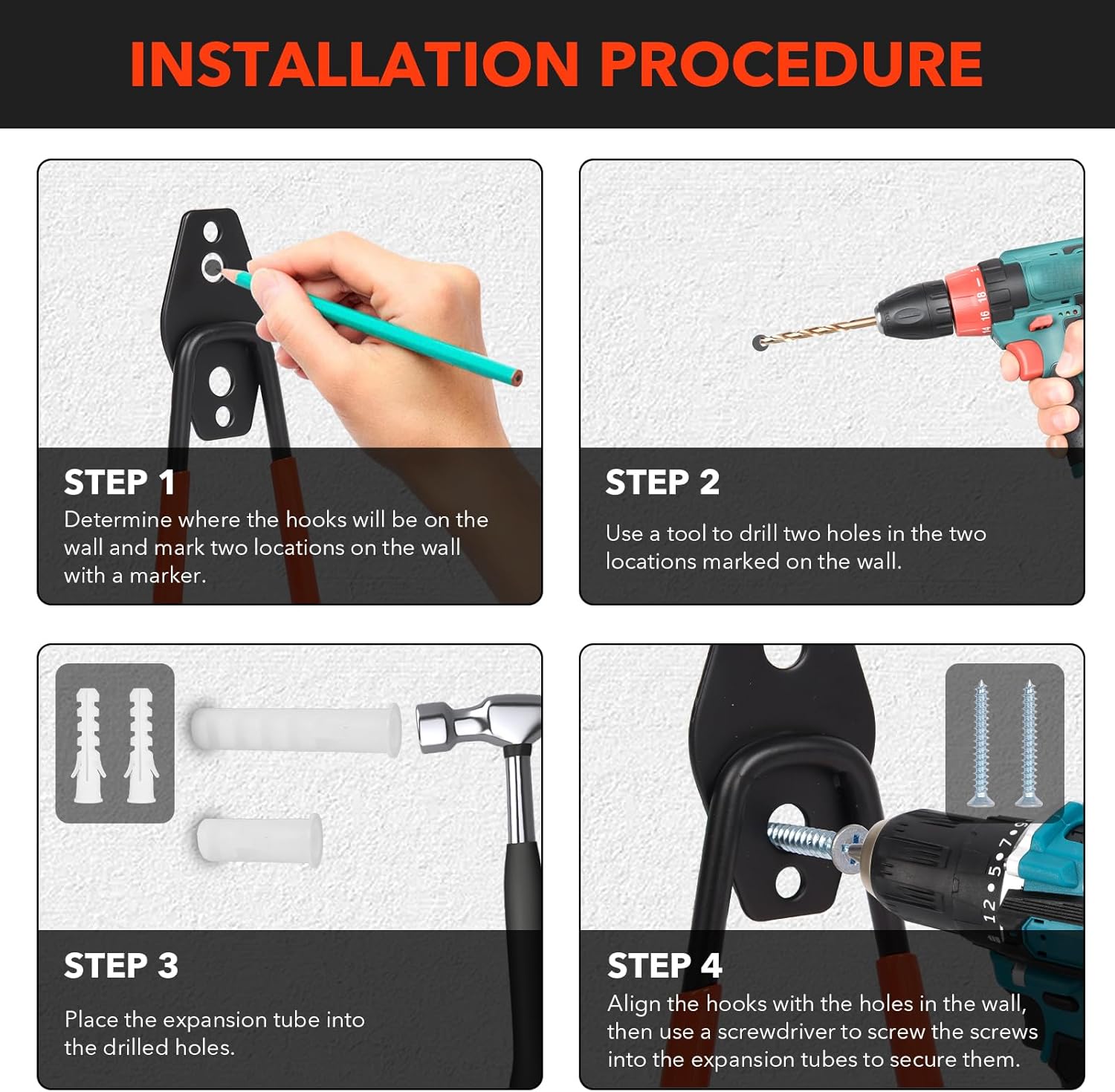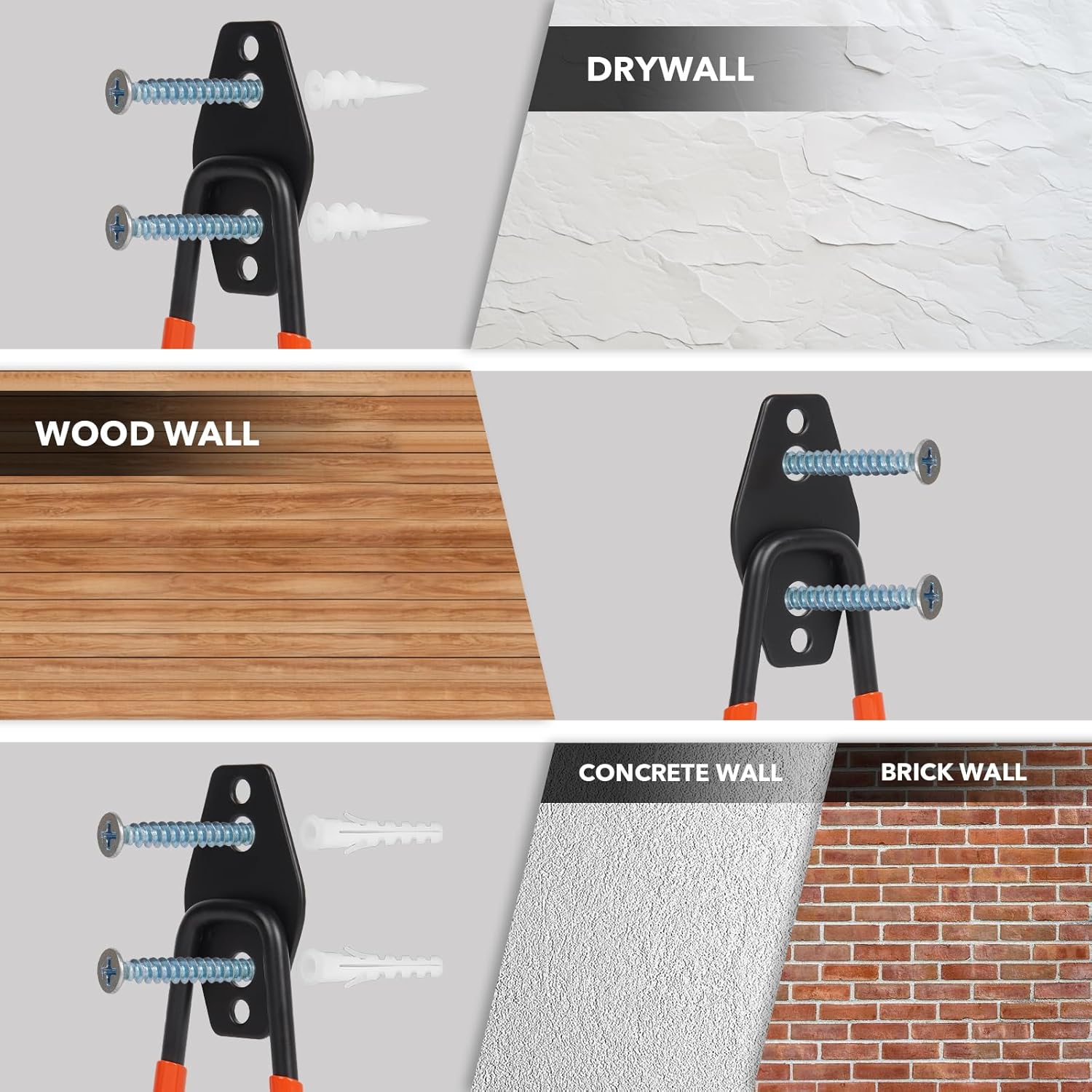 • 5. Garage Organizer: When purchasing our Heavy Duty Garage Hooks, you'll receive 2 heavy-duty hooks, 4 reinforced wall anchors, and 4 corrosion-resistant screws. Effortlessly transform your space by maximizing vertical storage capacity, clearing floor clutter, and establishing a streamlined organizational system.