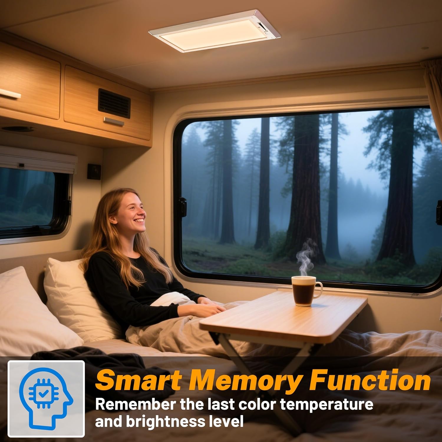 - Sleek Stylish Design&Memory Function:The RV ceiling light has an Ultra-Thin design, measuring 5.5*11.8*0.5in, with a sleek ABS silver shell that exudes a modern and minimalist aesthetic.The RV ceiling light fixtures feature smart memory function, seamlessly restoring your chosen color temperature and brightness settings every time they are turned on.Say goodbye to the hassle of readjusting lights every time you turn them on, Saving Your Precious time And Energy For The Adventures That Await.