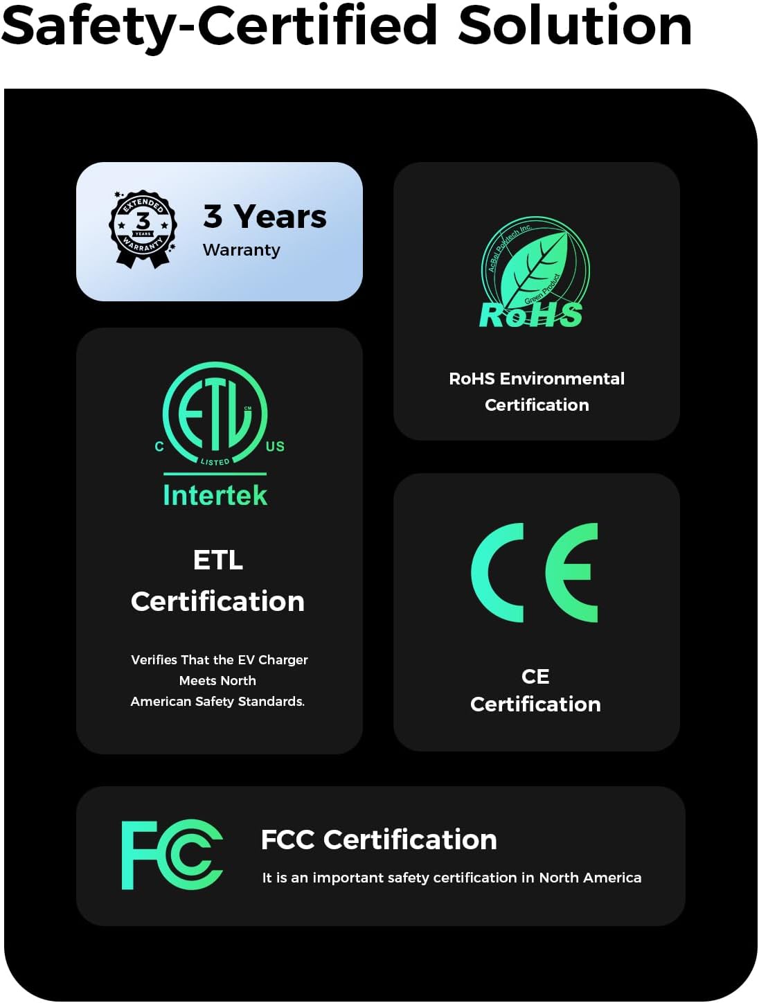 - Safe and Trustworthy: Our smart EV Charger Level 2 has passed ETL certification, FCC certification, and Energy Star certification, ensuring charging safety. These multiple certifications guarantee the high quality and reliability of the device, giving you peace of mind during use. Choose our smart charging gun for a safe, reliable, and efficient charging experience.