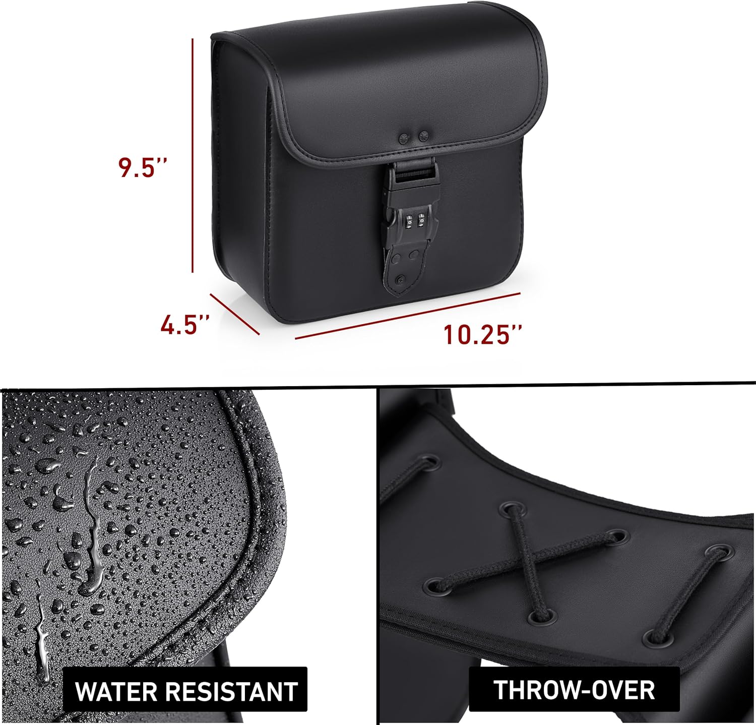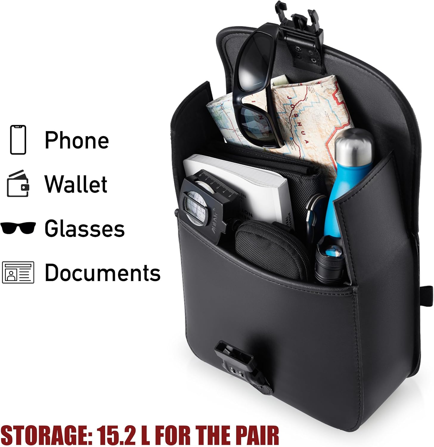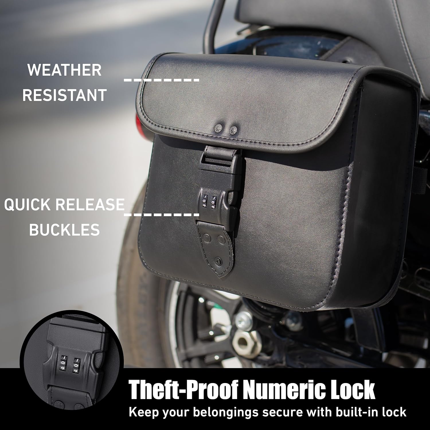 - Saddlebags Storage Capacity: With 7.4 liters of storage capacity, these throw over saddlebags keep your essentials close and organized while on the road. The cruiser motorcycle saddlebags measure 10.24” x 9.45” x 4.57” (L x W x H) and spacious saddlebags offer ample space to store items such as raincoats, water bottles, lighters, sunglasses, wallets, keys, phones, locks, food, and more. Enjoy the convenience of having your daily necessities within easy reach.