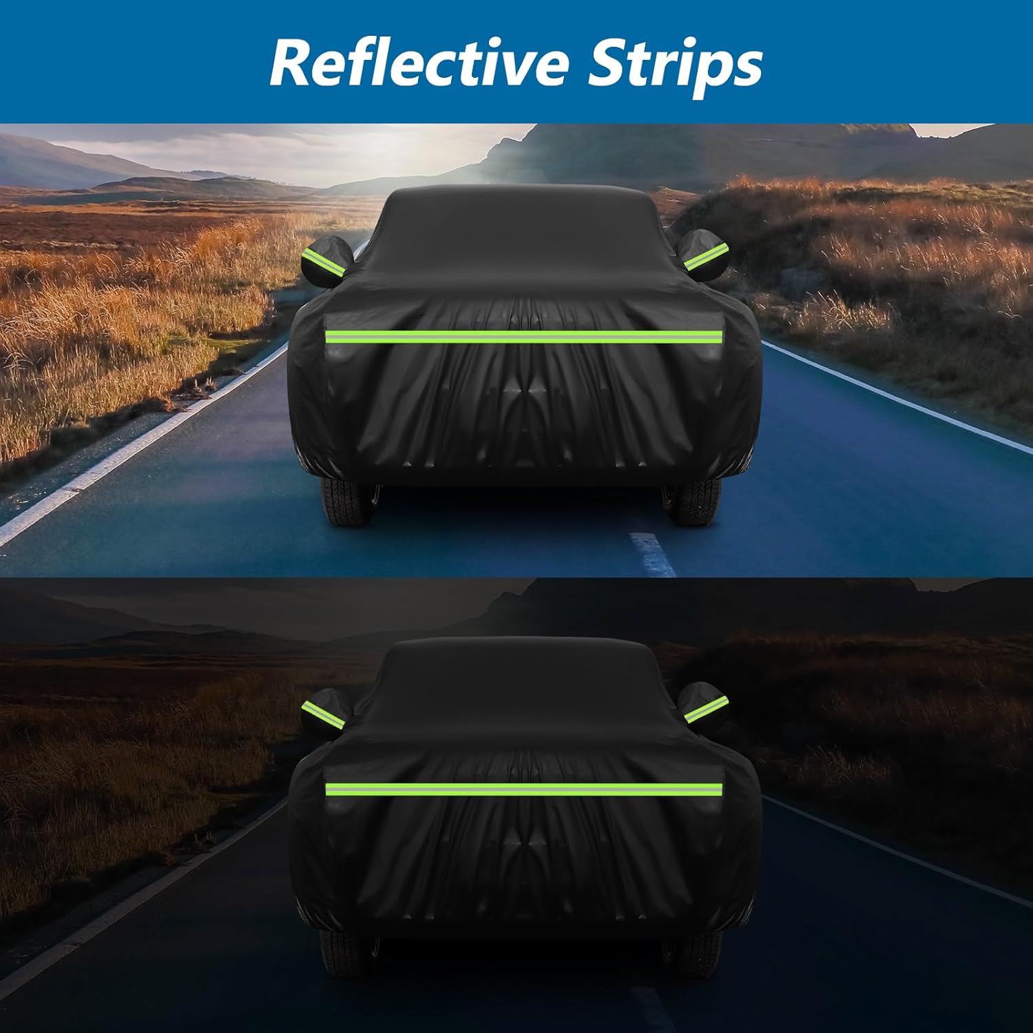 - 【Reflective Strips and Driver-Side Zipper Designs】(1) Black Coating: UV protection and heat-proof, prevent cracking and aging of inner decoration leather and plastic. (2)5 Reflective Strips attached on the front DRL lamps, middle Turning lights, and Rear taillight to prevent collisions during the night. (3)It has four straps, a windproof buckle, and a storage bag. (4)Mirror Pocket: protect the rearview mirror in all directions. (5) A zipper on the cab side for convenience.