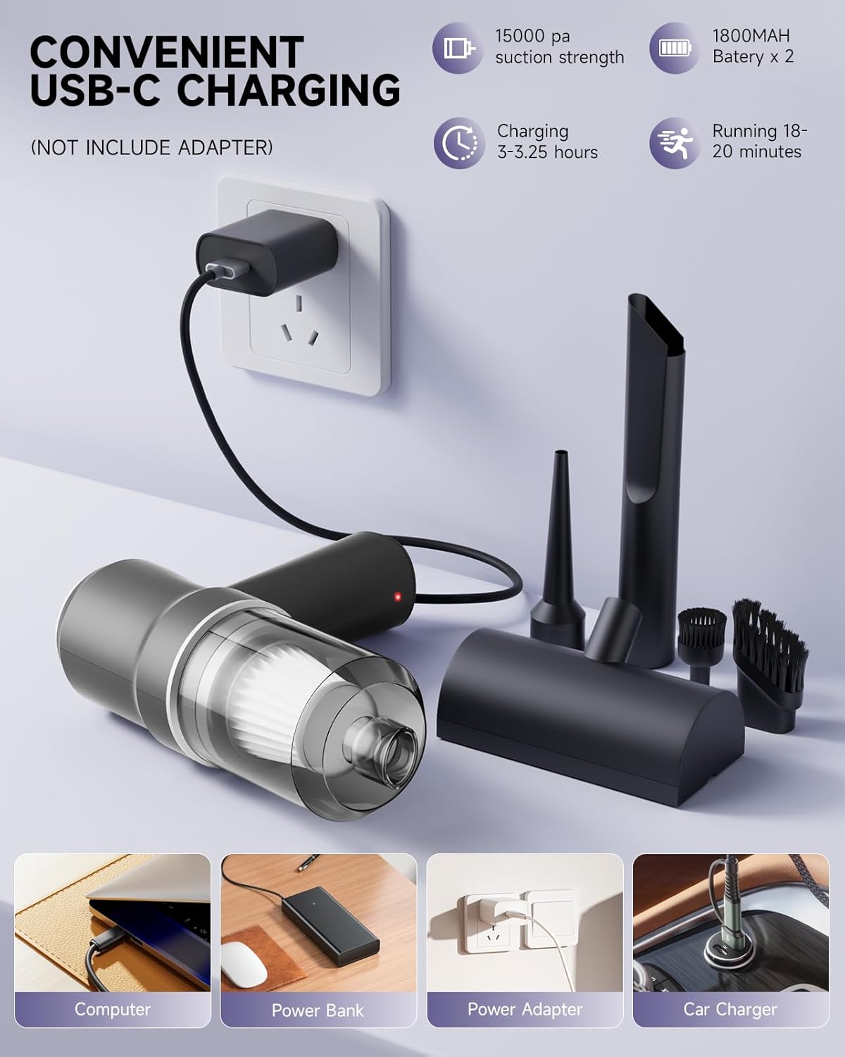 - 【Convenient Cordless & Rechargeable Design】Enjoy cord-free use with this hand vacuum cordless rechargeable unit (dual 1800mAh batteries). As a reliable hand held vacuum, it recharges via included Type-C charging cable (Needs Adapter) from car charger, power bank, laptop. Flexible charging suits mobile use. A 3-hour fully charged yields 20 minutes of strong suction. Allows substantial cleaning without cord limits, enhancing usability anywhere.