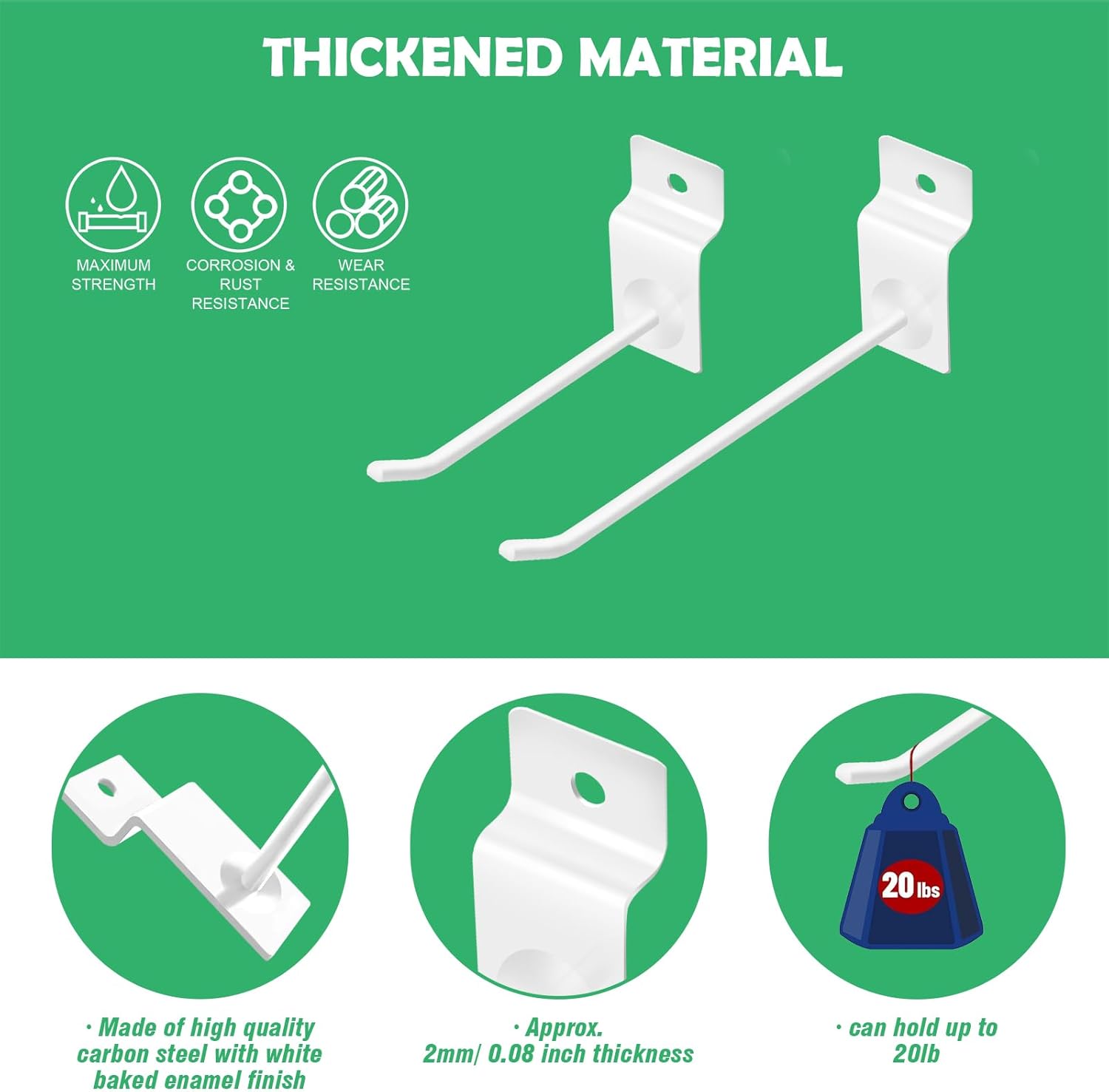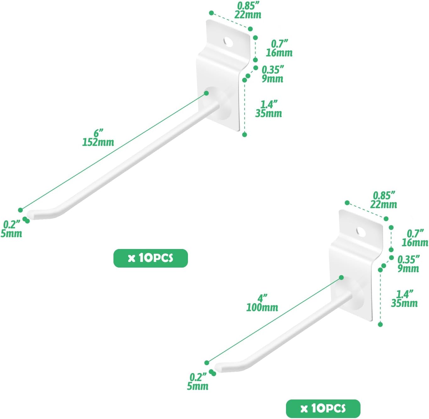 - [What you Get] The white slatwall accessories kit contains 10pcs 4”/ 10cm slatwall hanger hooks, 10pcs 6”/ 15cm slatwall hanger hooks, totally 20pcs. The nice the combination of enough quantity will meet your space planning or replacement needs.