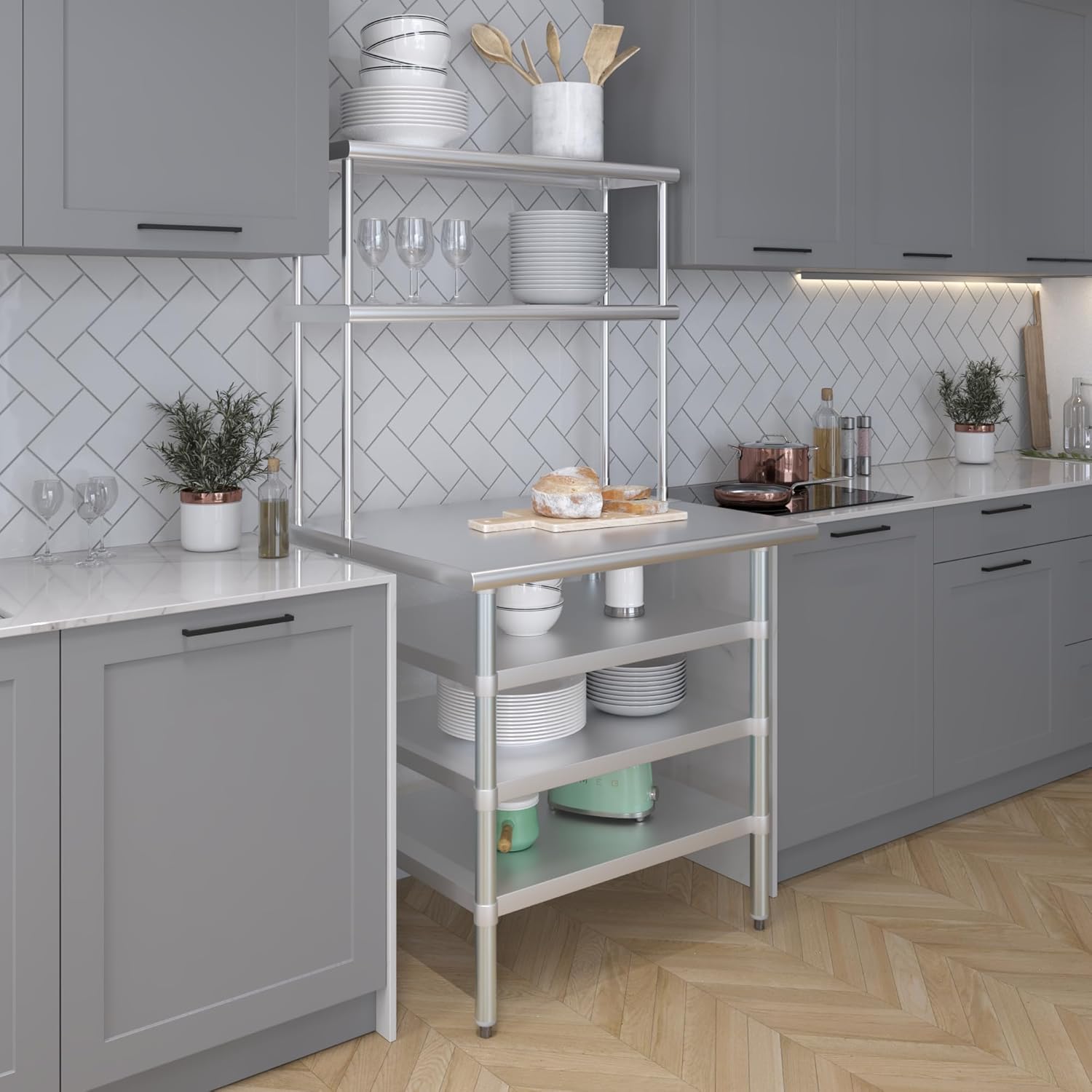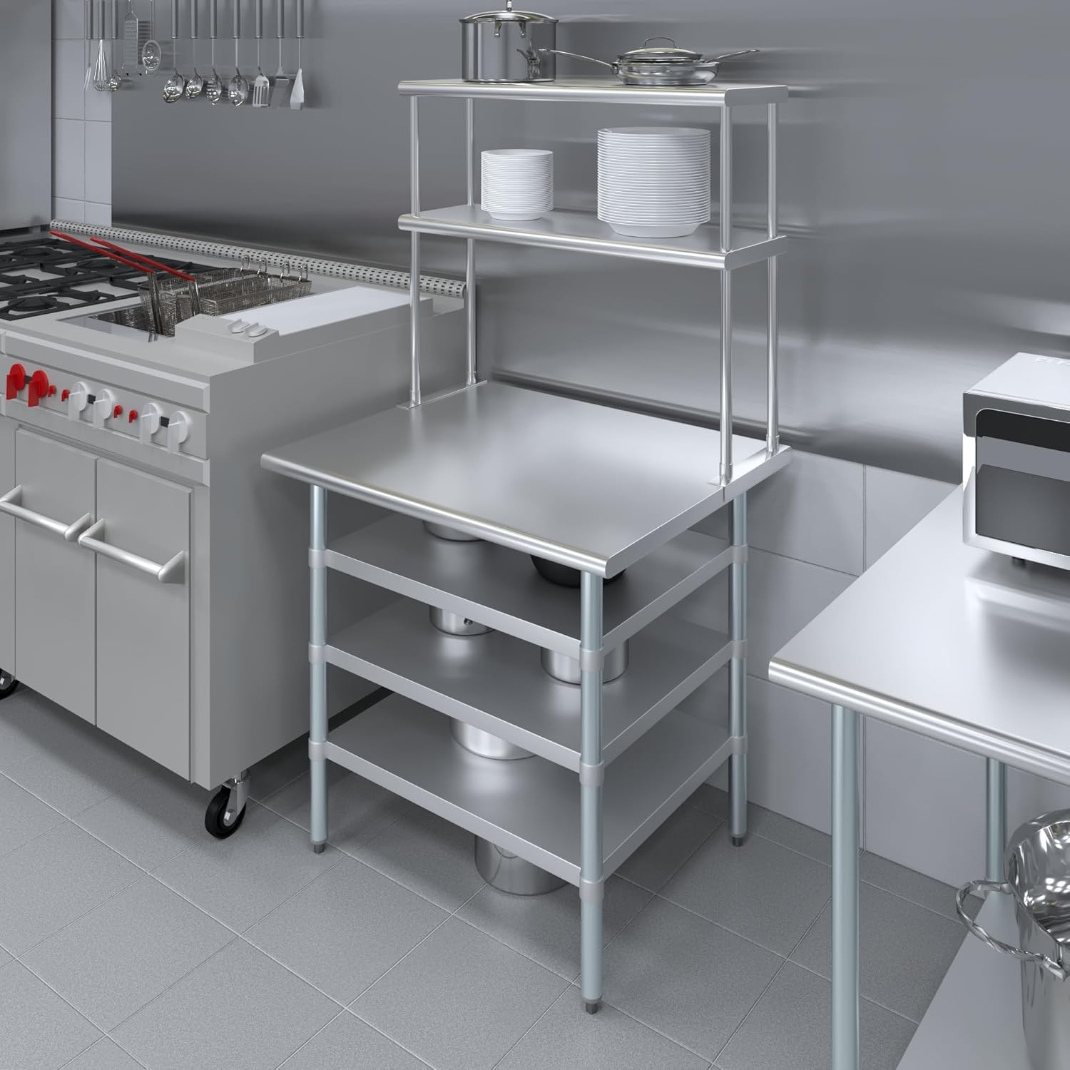 - WORK SAFETY: Work table top and double tier adjustable shelves are constructed from 18-gauge stainless steel, making this restaurant prep and serve table and double tier shelf combo set is durable and long lasting. The table top comes with a galvanized under-shelf for additional storage and adjustable legs for convenience. This table and shelf set is specifically designed and finished for use in a commercial or industrial setting, but is just as reliable in the home.