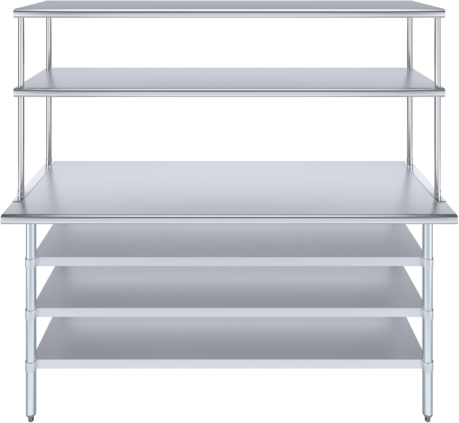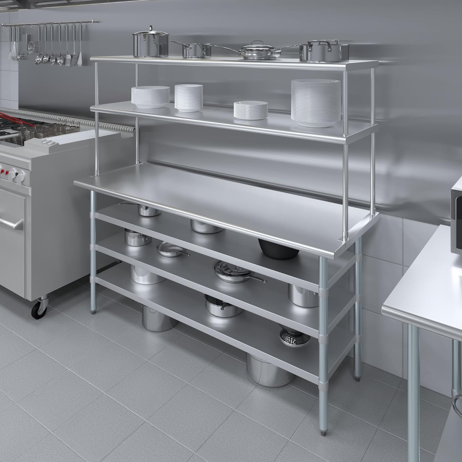 - WORK SAFETY: Work table top and double tier adjustable shelves are constructed from 18-gauge stainless steel, making this restaurant prep and serve table and double tier shelf combo set is durable and long lasting. The table top comes with a galvanized under-shelf for additional storage and adjustable legs for convenience. This table and shelf set is specifically designed and finished for use in a commercial or industrial setting, but is just as reliable in the home.
