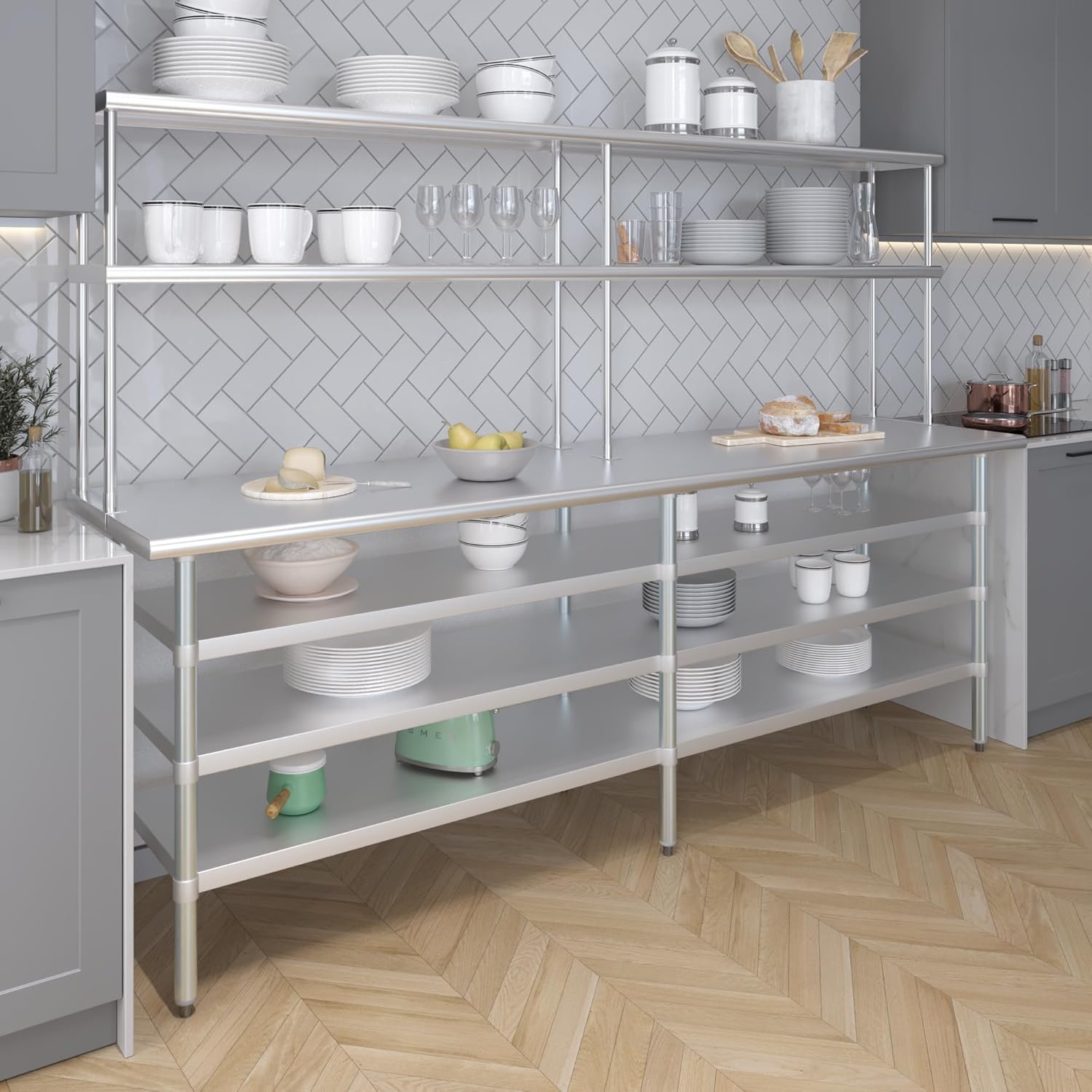 - WORK SAFETY: Work table top and double tier adjustable shelves are constructed from 18-gauge stainless steel, making this restaurant prep and serve table and double tier shelf combo set is durable and long lasting. The table top comes with a galvanized under-shelf for additional storage and adjustable legs for convenience. This table and shelf set is specifically designed and finished for use in a commercial or industrial setting, but is just as reliable in the home.