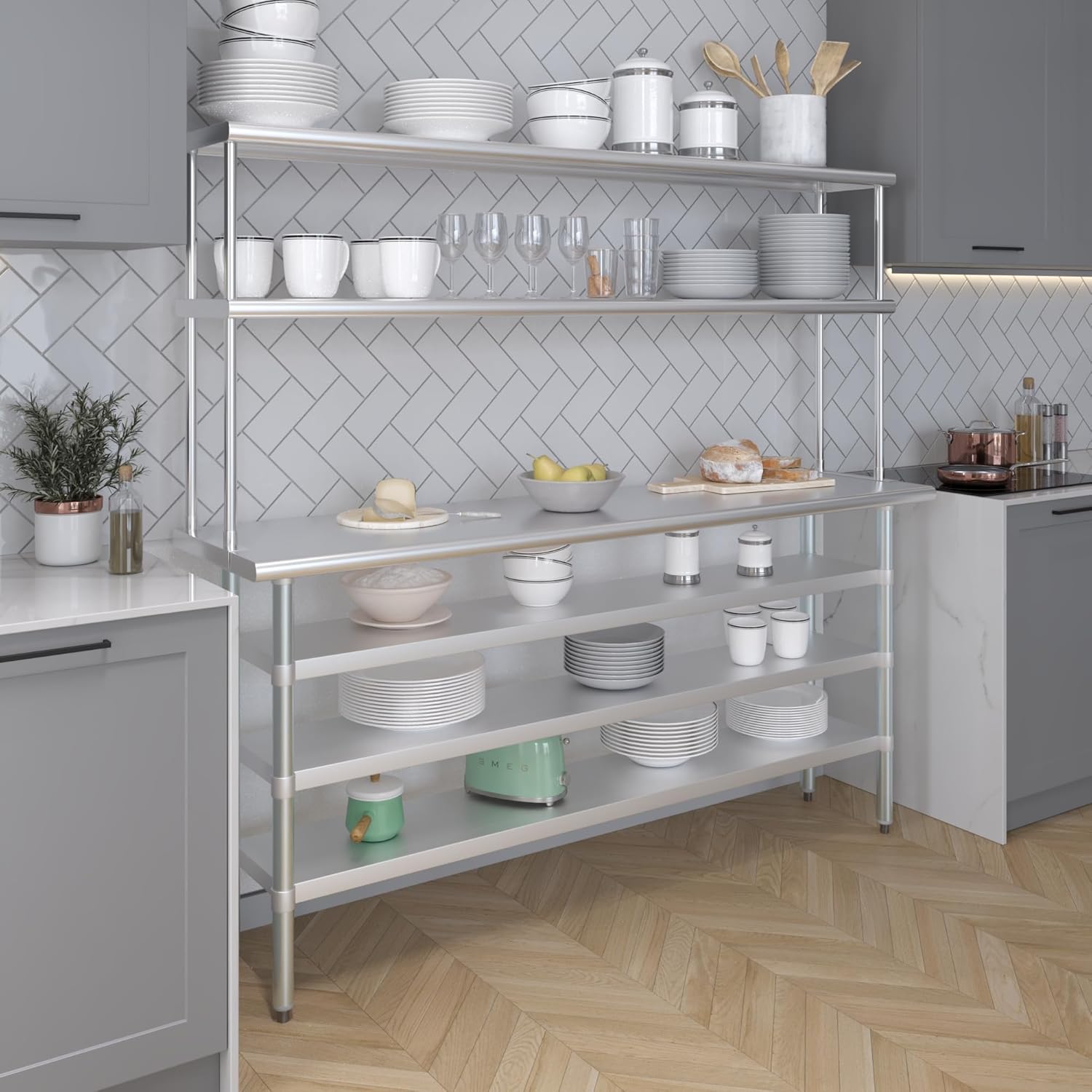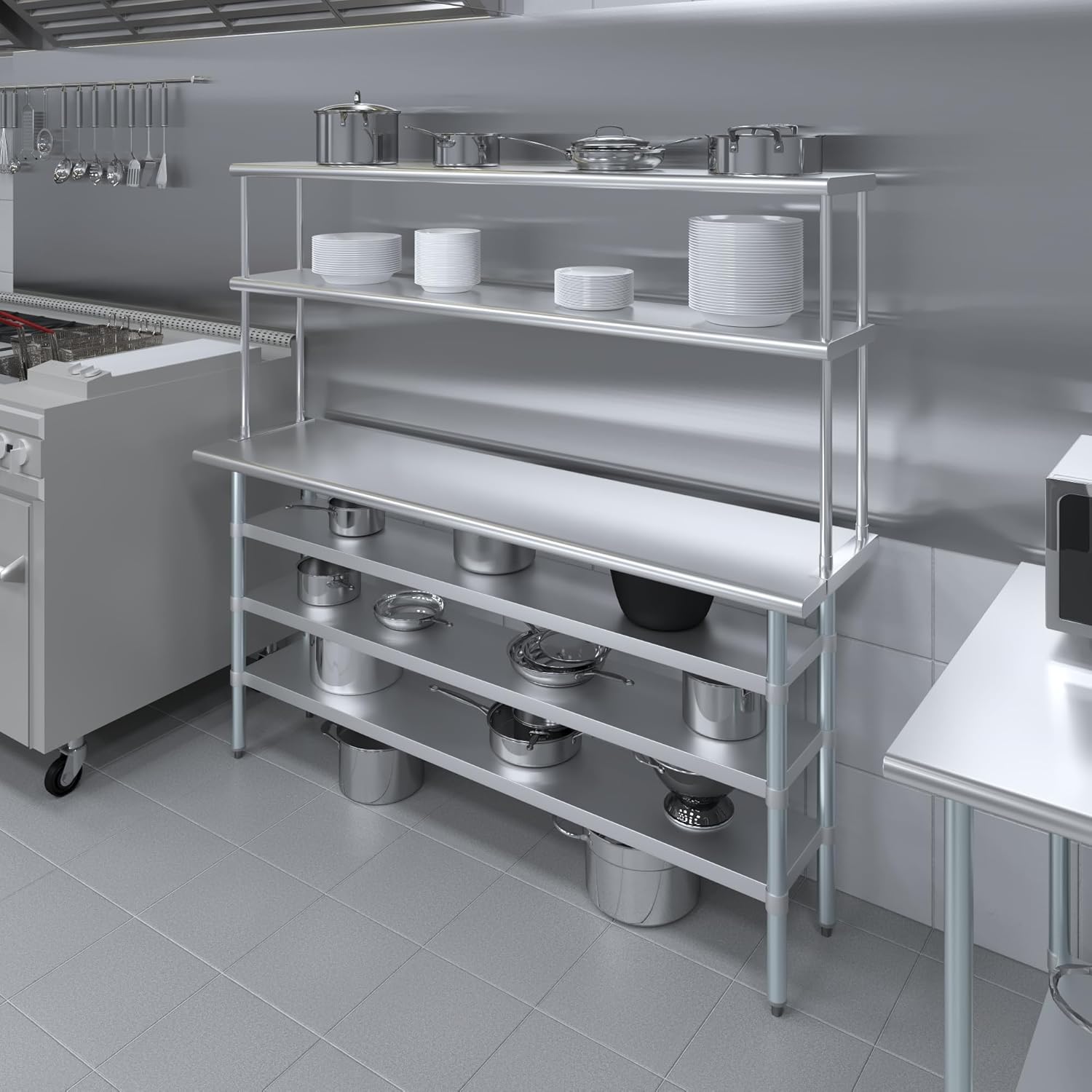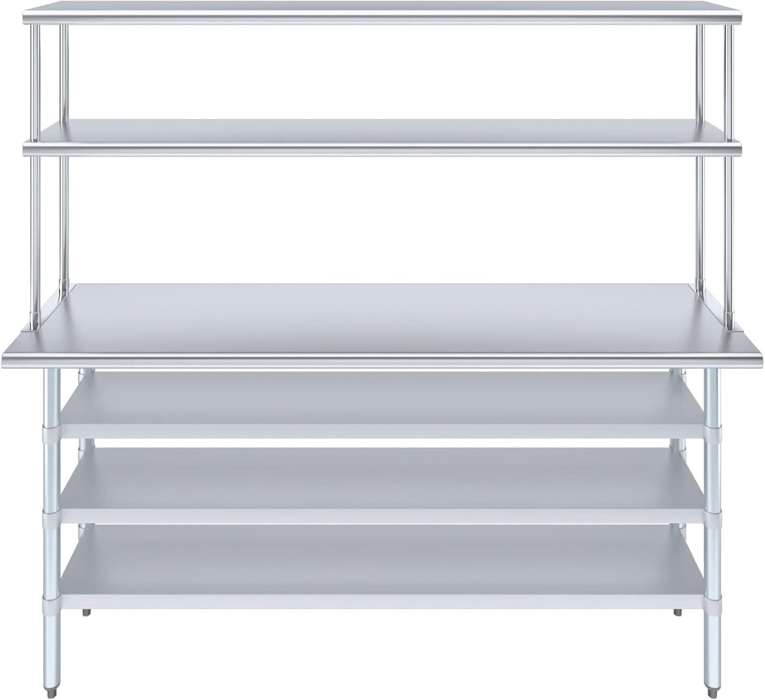 - WORK SAFETY: Work table top and double tier adjustable shelves are constructed from 18-gauge stainless steel, making this restaurant prep and serve table and double tier shelf combo set is durable and long lasting. The table top comes with a galvanized under-shelf for additional storage and adjustable legs for convenience. This table and shelf set is specifically designed and finished for use in a commercial or industrial setting, but is just as reliable in the home.
