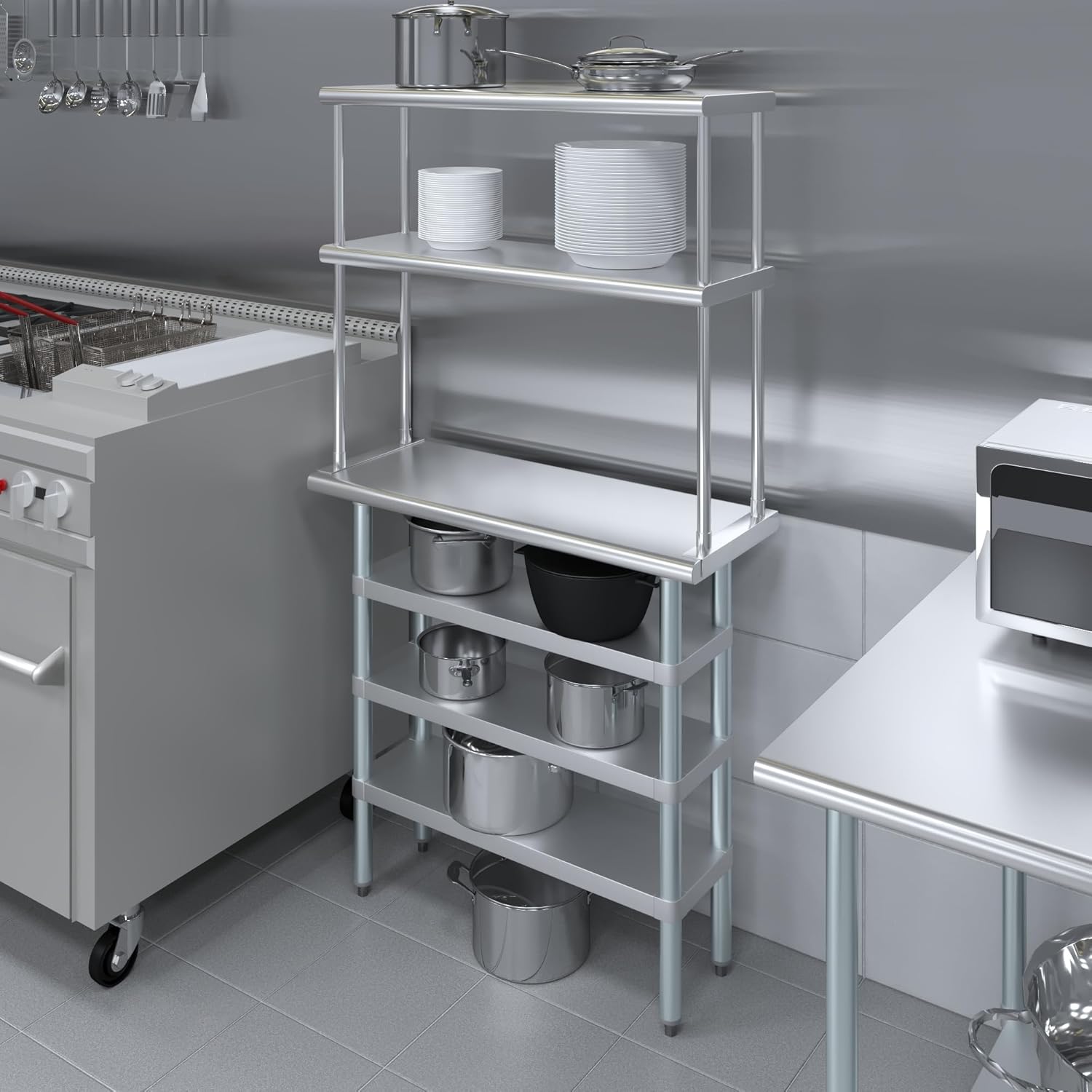 - WORK SAFETY: Work table top and double tier adjustable shelves are constructed from 18-gauge stainless steel, making this restaurant prep and serve table and double tier shelf combo set is durable and long lasting. The table top comes with a galvanized under-shelf for additional storage and adjustable legs for convenience. This table and shelf set is specifically designed and finished for use in a commercial or industrial setting, but is just as reliable in the home.