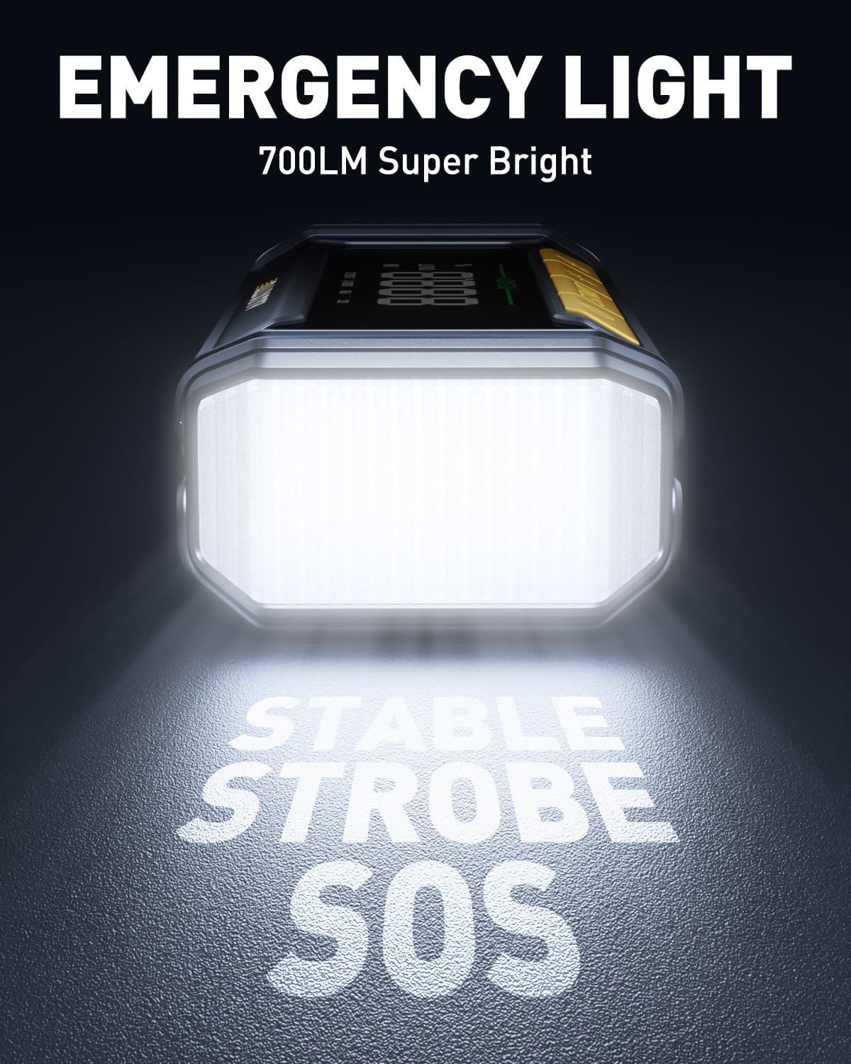 - Powerful LED Flashlight: With a brightness of 700LM, the built-in LED flashlight is perfect for camping, outdoor activities, emergencies, and travel. Three lighting modes (Lighting, Strobe, SOS) can cope with different emergency situations and can last for more than 96 hours. This versatile tool adds extra functionality to the jump starter for all-around convenience.