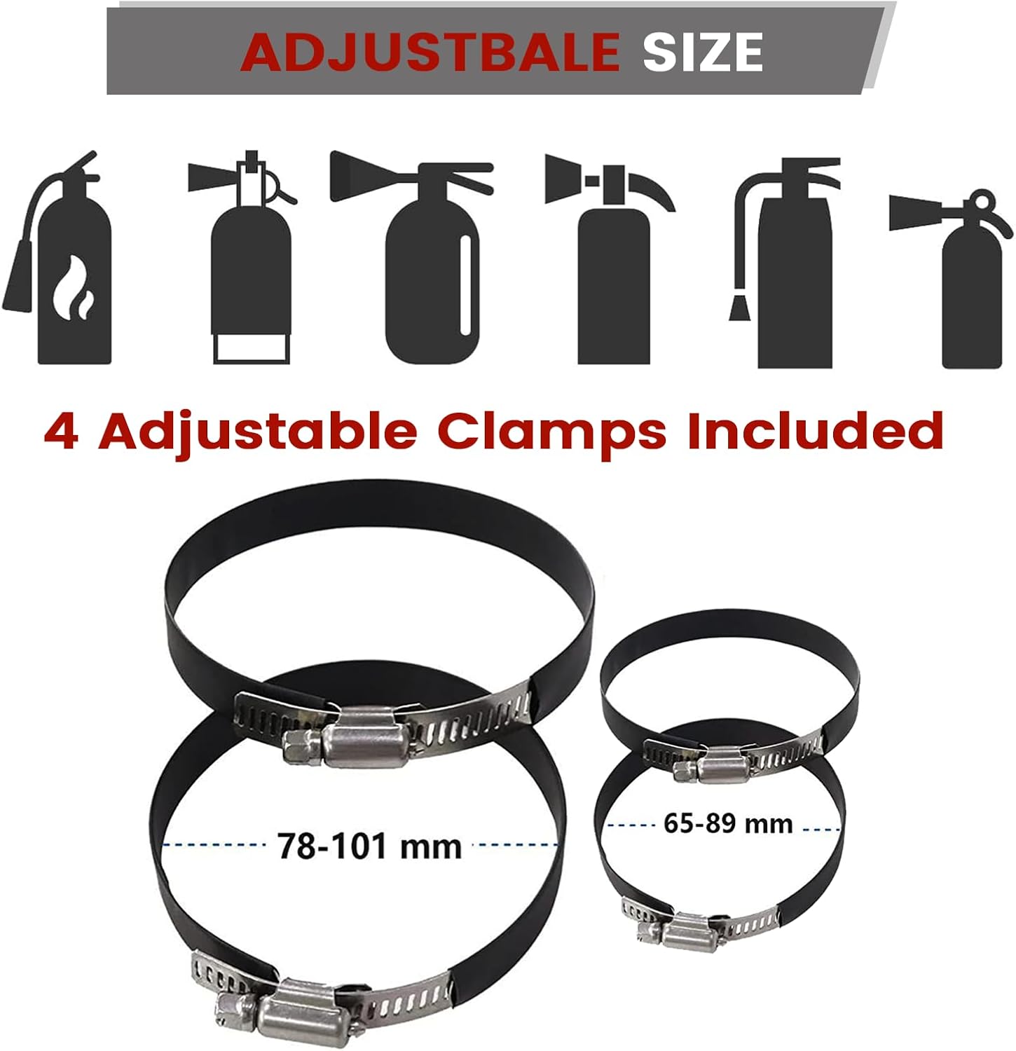 • The Ultimate Package:1x fire extinguisher holder (base and separable holder), 4x adjustable rings for a snug fit and 2x Spacers for a wider fit, and our commitment to assist you on your thrilling journey