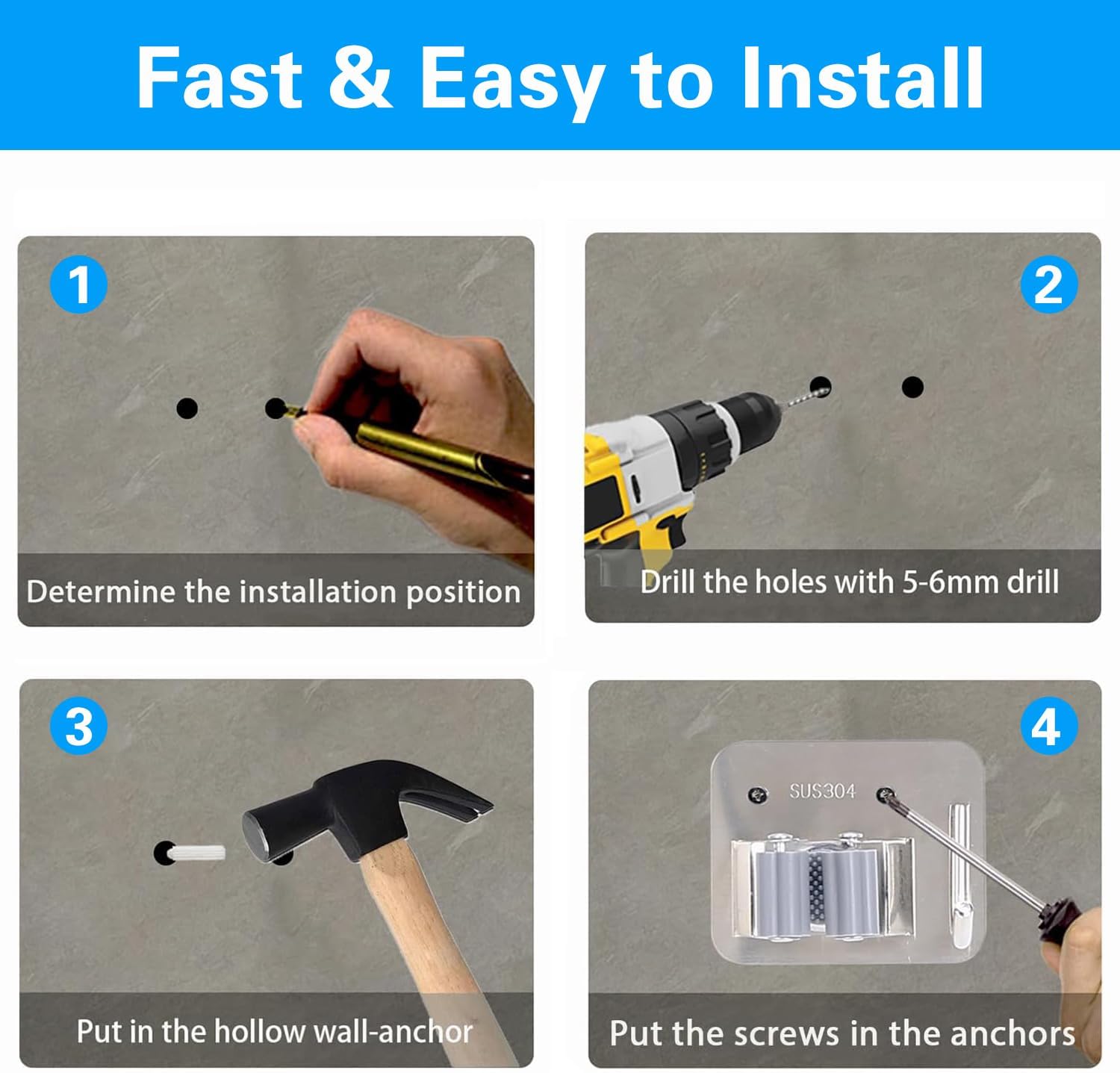 - [EASY TO INSTALL & USE] - Comes with all the screws and wall anchors necessary to attach broom rack to drywall. Installation is pretty simple and took less than five minutes. Suitable for weighty or outdoor hanging. It is easy to use. Just push the mop or broom handle into the clamps after finish your household cleaning. Our mop holder can stand up to 15 KG, more strong and sturdy than the plastic or wooden holder.