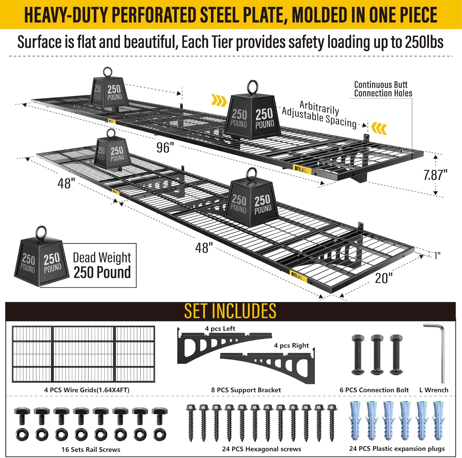 - KIT INCLUDES:Includes 1pc-Grid Shelf; 2pc-Brackets; 6pc-Hexagonal screws (Hardened ∅0.2" L/2"); 4Sets-Rail attachment bolts; 1pc- Drill bit; 1pc-Socket; 1pc-installation manual. All hardware of Brukid Professional Series Wall Mounted Shelf are under strict quality control and testing, We strive to provide our customers with a quality shopping experience, If you have any questions, Please feel free to contact us