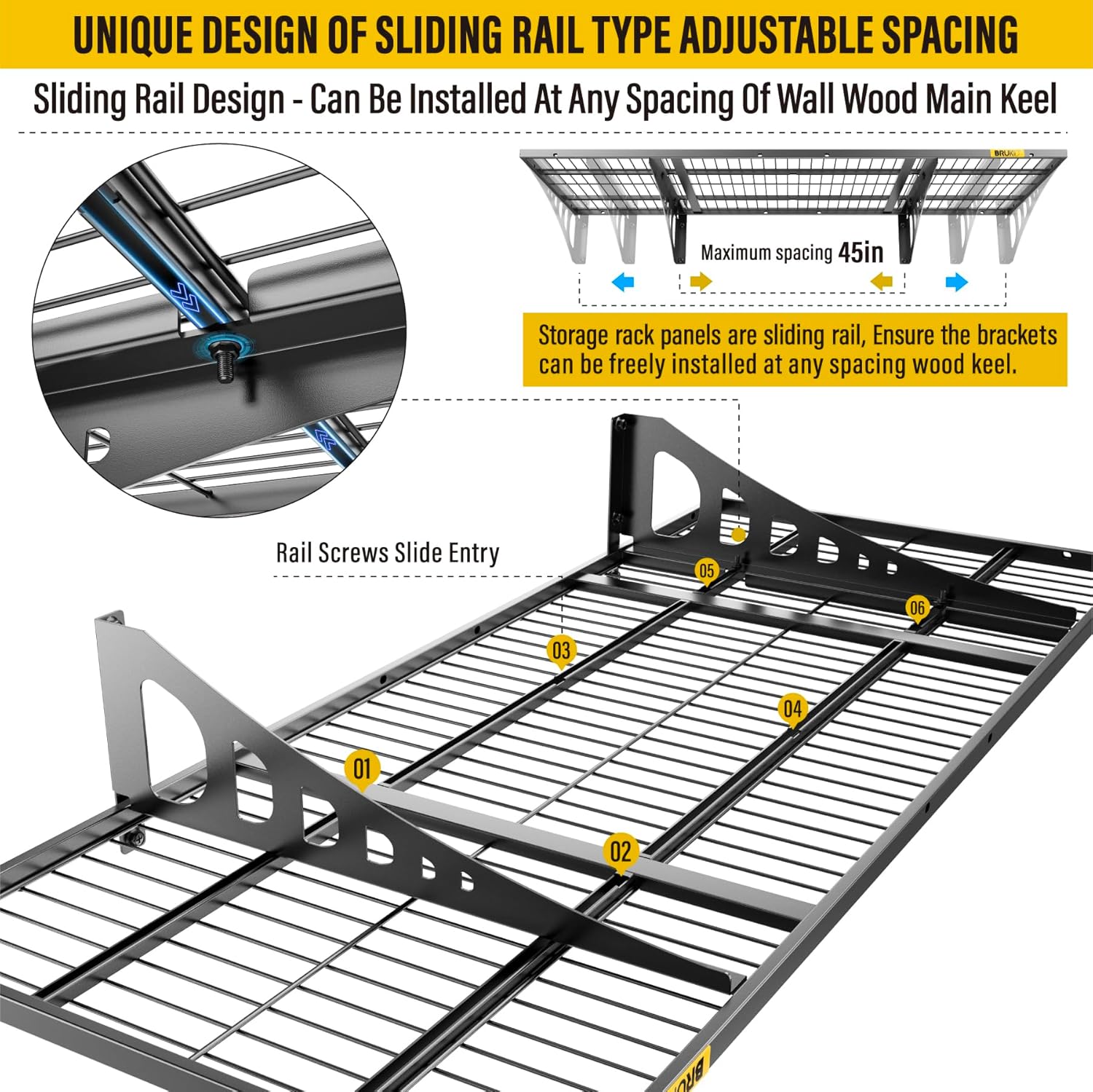 - SUPERIOR DESIGN: Wall shelf garage storage rack is made of heavy-duty frame structure and thicker wire mesh combined with welding, the panel and bracket connection is adjustable slide rail design, Both ends of the bracket can be installed freely in the 8"-45" range of wood wall keel spacing. Eliminating the worry of not being able to connect due to the mismatch of the spacing of the load-bearing wooden wall keel
