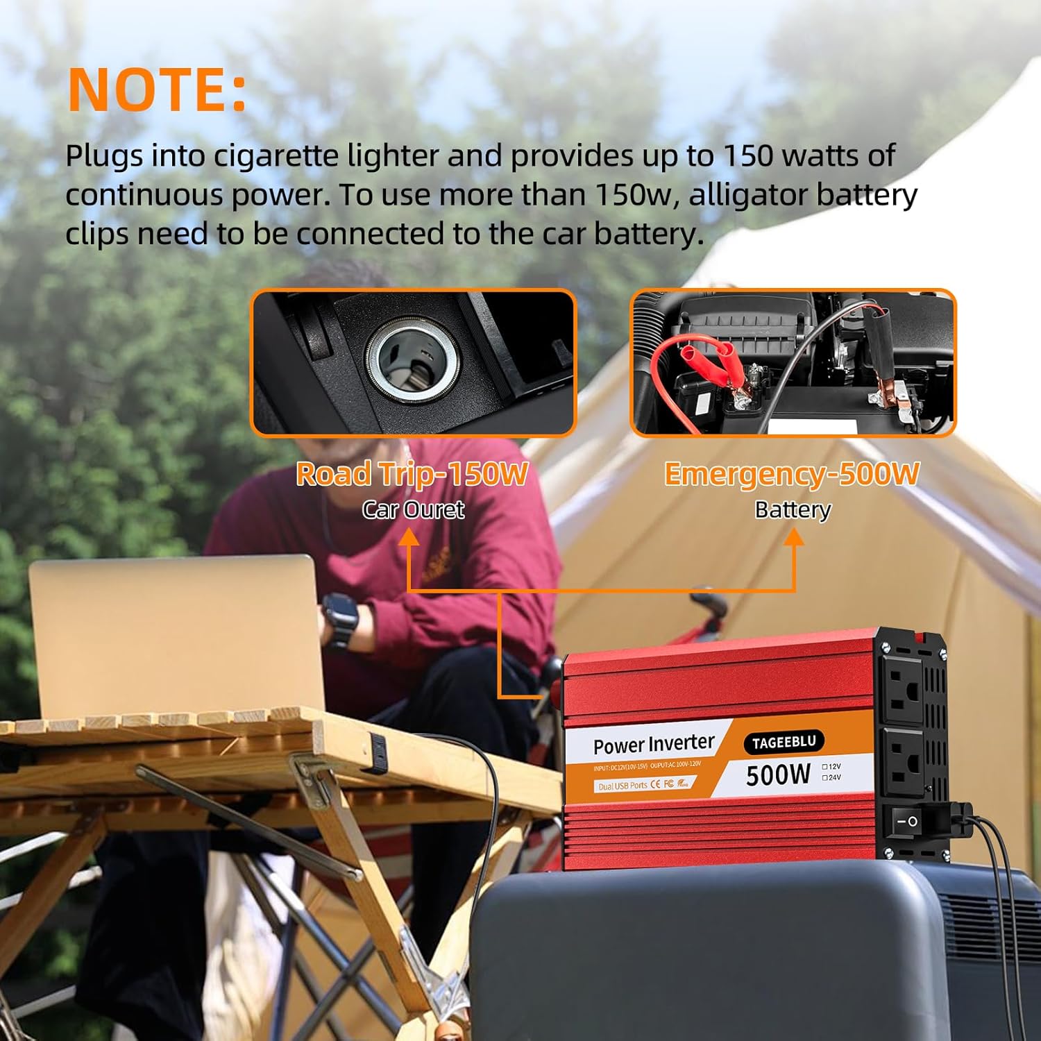 500W Power Inverter DC 12V to 110V/120V AC Car Inverter with 2 x 3.0A USB Ports and Dual AC Outlet, Equipped with 1 Cigarette Lighter and 2 Battery Clamps for Road Trip and Camping