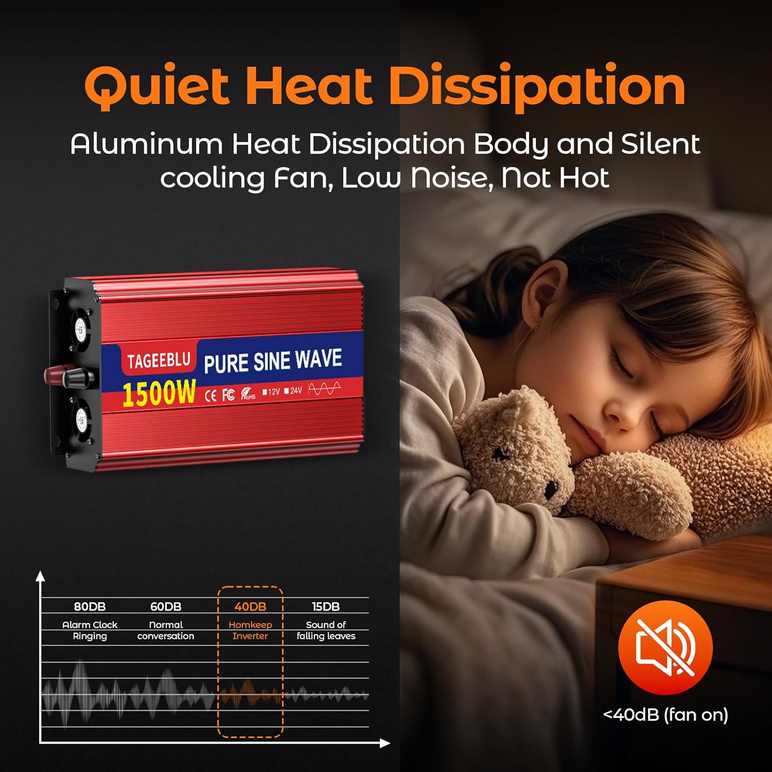 - 【Pure Sine Wave Inverter】The power inverter output waveform is consistent with the AC waveform of the utility grid and is suitable for inductive and capacitive loads. It extends the service life of the equipment and reduces the fault rate. Can be used with electrical equipment such as televisions, home theaters, car stereos and other sensitive loads for a long time.Operating noise is less than 40 dB, ensuring a quiet environment
