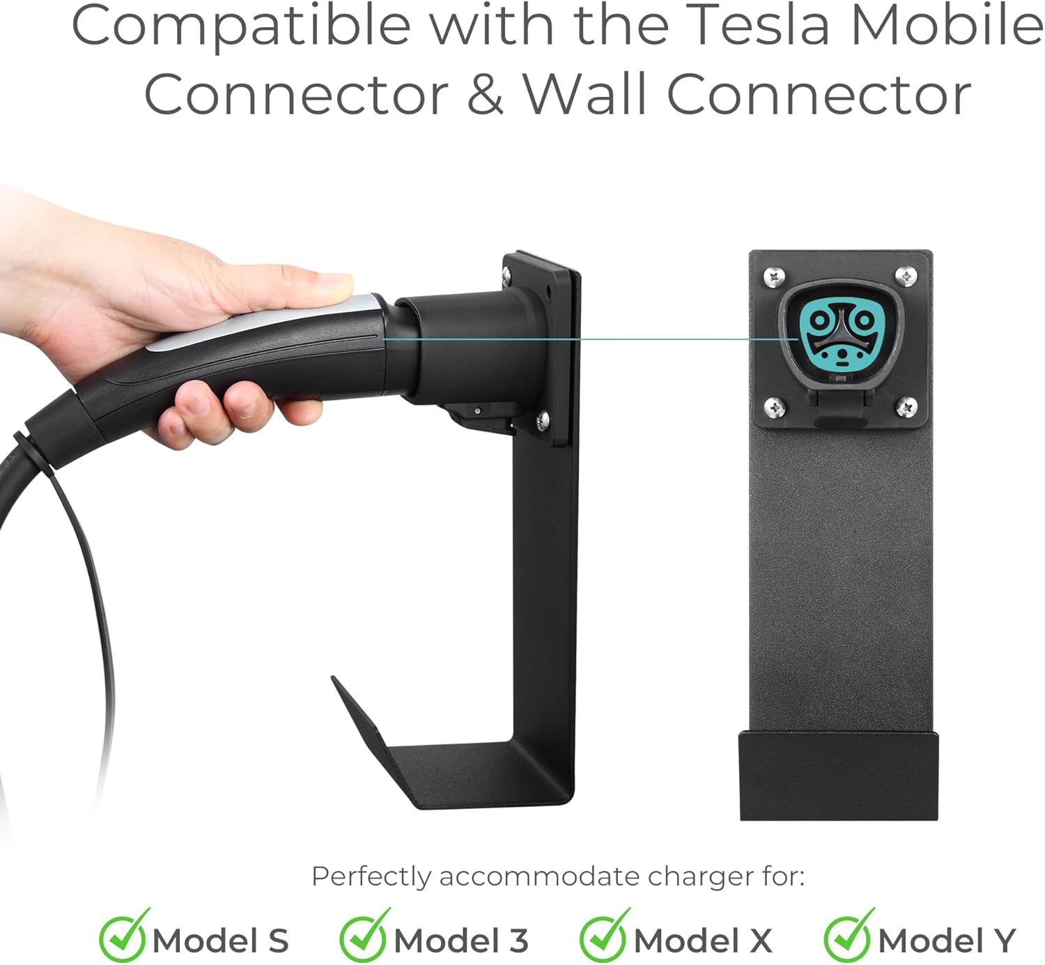 - SIMPLE TO USE - Compatible with the Tesla Mobile Connector and Wall Connector, the holster grips the nozzle firmly, preventing it from falling out, while the J-Hook keeps the cable off the ground, preventing kinks and tangles