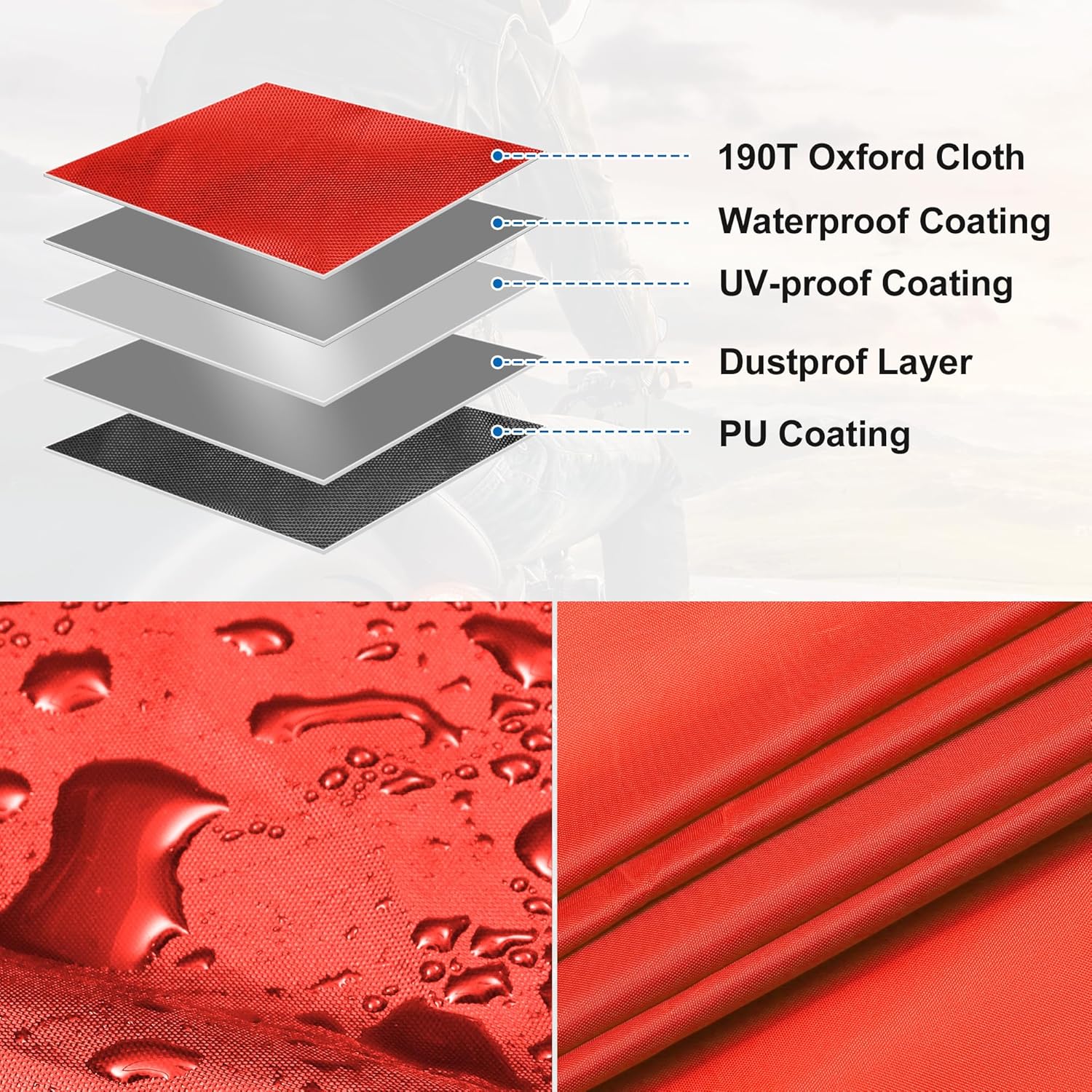 - Waterproof Windproof Upgrade: The motorcycle cover is made from 190T polyester, with the seam applied with PU glue, so it is rainstorm-proof. Adjustable Elastic Band at the lower hem of the cover can press the cover against the motorcycle body closely. In addition, there is a buckle at the bottom to prevent the cover from being blown away.