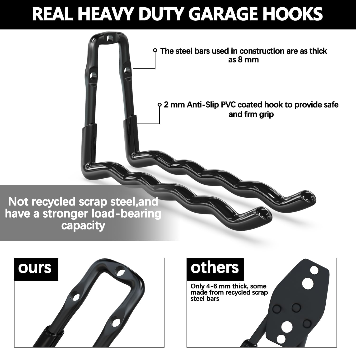- Upgraded steel thickness from 6mm to 8mm: 3-H product passed the GS certified. Our heavy duty garage hooks are made of steel bars typically used in construction as thick as 8mm, not recycled scrap steel, so that our garage organizer can hang 10kg more weight than traditional garage hooks for hanging. The garage organization hooks have an anti-slip PVC coating for a secure grip and scratch protection. These bike hangers for garage are suitable for hanging heavy objects and are not easily bent