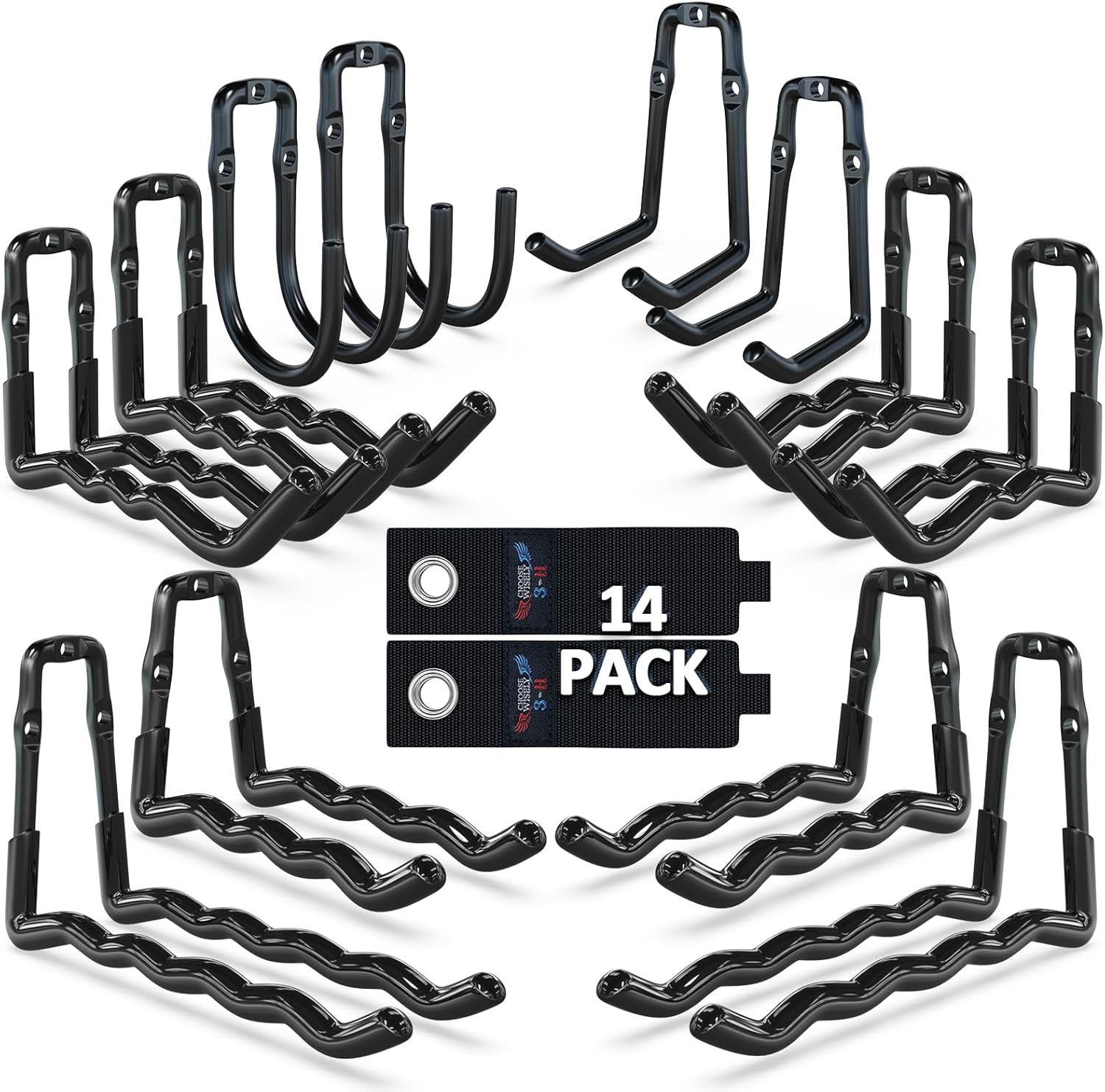 3-H Heavy Duty Garage Hooks 14 Pack, One-Piece Construction Garage Wall Hooks, Garage Hanger & Organizer Wall Mount for Ladders, Bikes, Chairs, WeedEaters, Shovels, Garden Tools (Black)