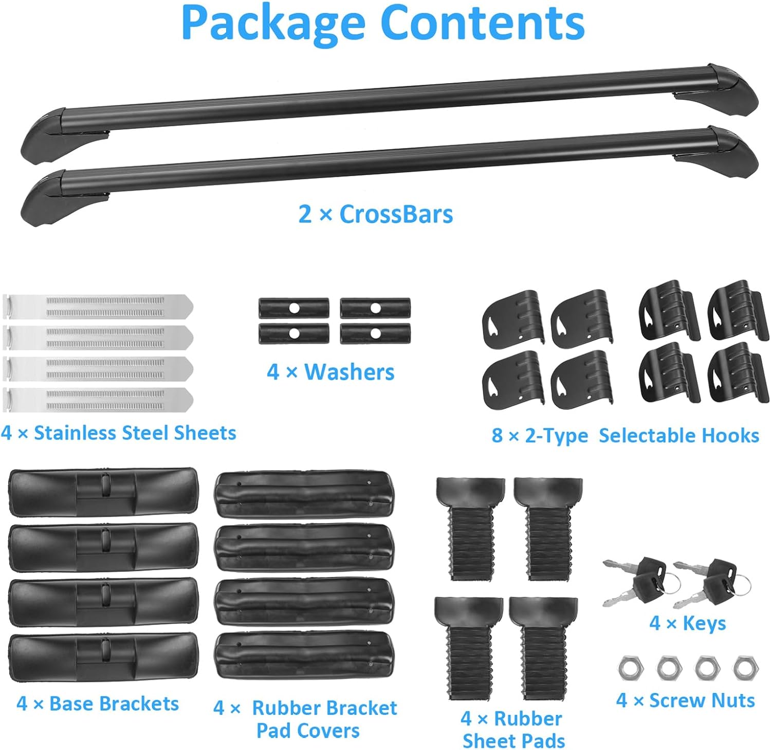 - EASY INSTALLATION: Well-equipped with mounting accessories which include premium base brackets, hooks, premium rubber pads, stainless steel braces and installation manual to help you finish the cross bar installation.