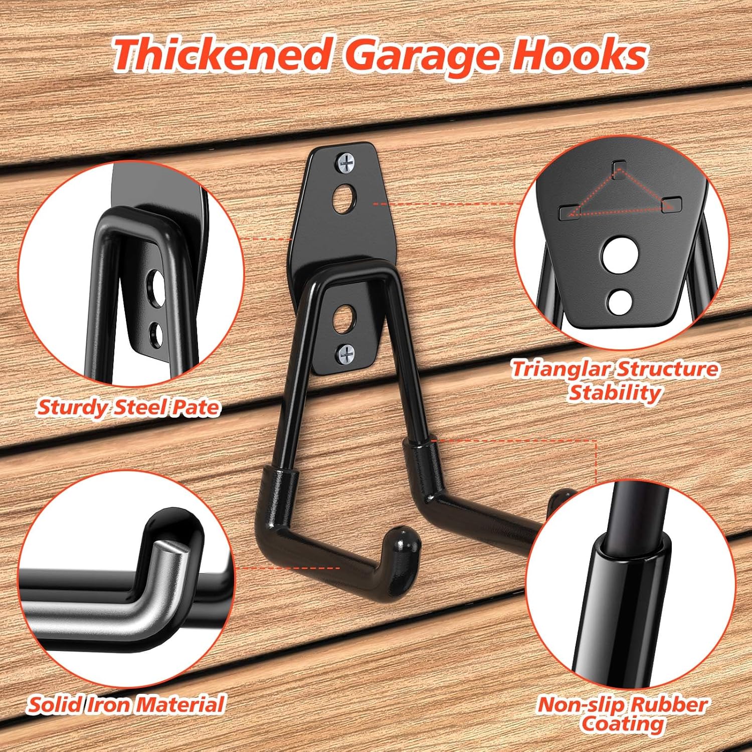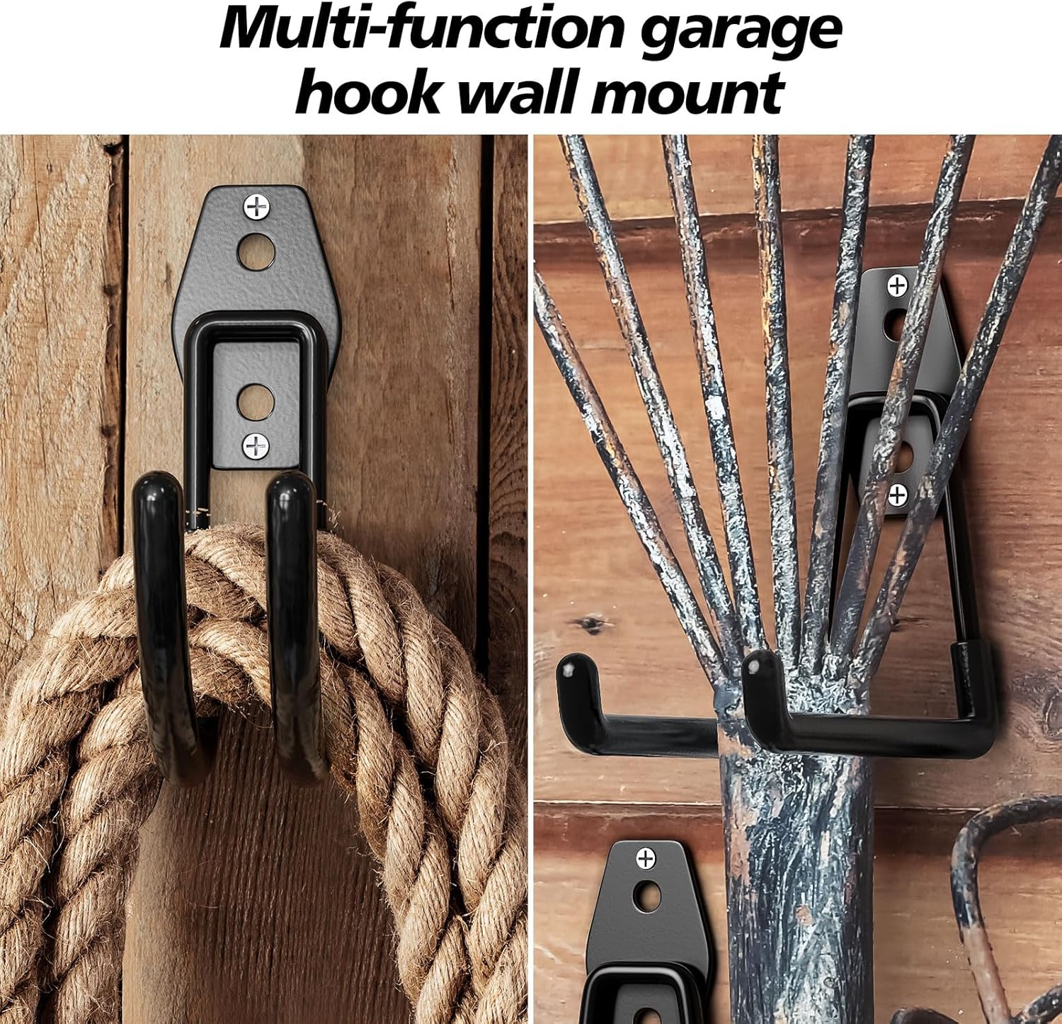 - SAVE STORAGE SPACE & MULTI-SCENARIO:Our wall mount garage hooks,designed for garages, workshops,and beyond,keep tools and equipment like bicycles,ladders,ropes,and more organized and off the floor,saving space and simplifying storage.Perfect for garden sheds,basements,and warehouses.Housewarming gift