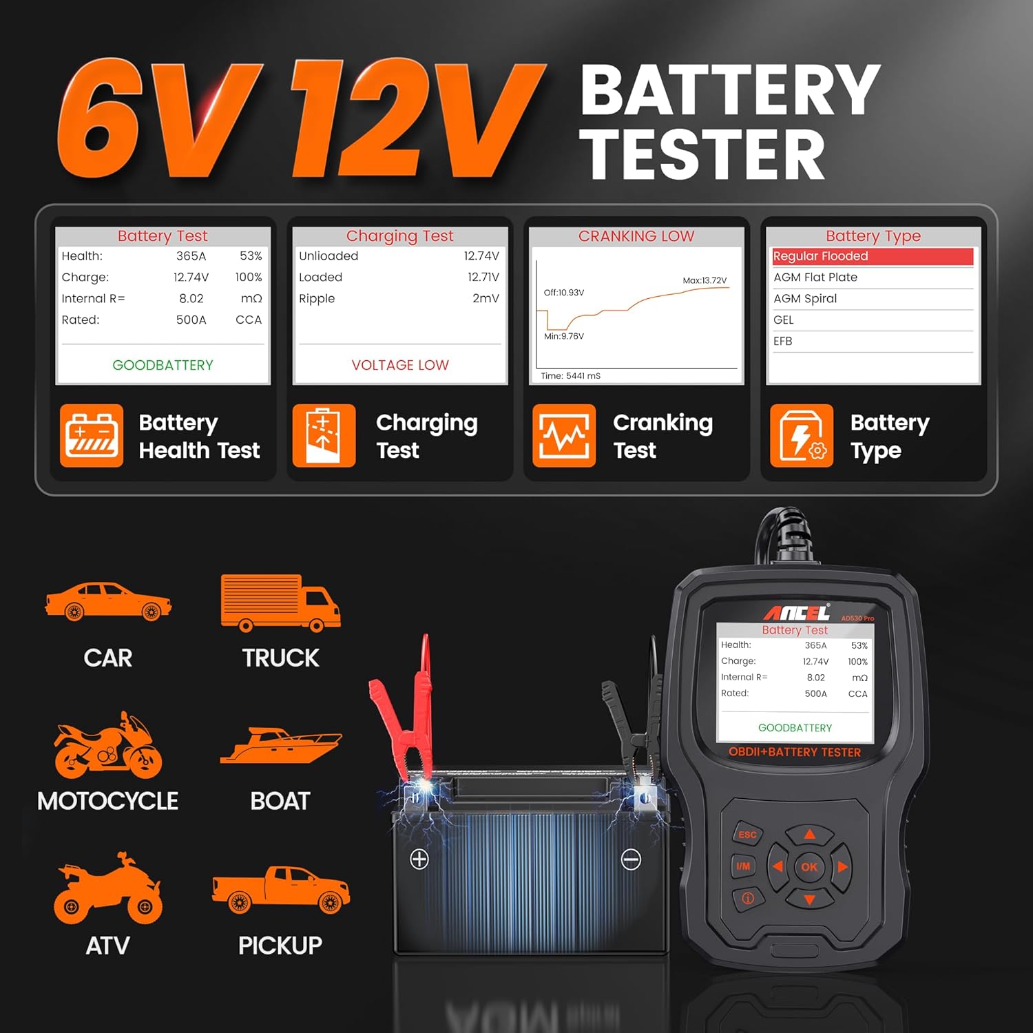 - Test Your Battery Before it Dies: Are you still struggling with batteries hard to start in winter? Car battery tester diagnoses all 12V 6V cars, motorcycles and other vehicles! With 99% accurate battery health testing, crank testing and charge testing for Regular Flooded, AGM Flat Plate, AGM Spiral, GEL, EFB common battery types