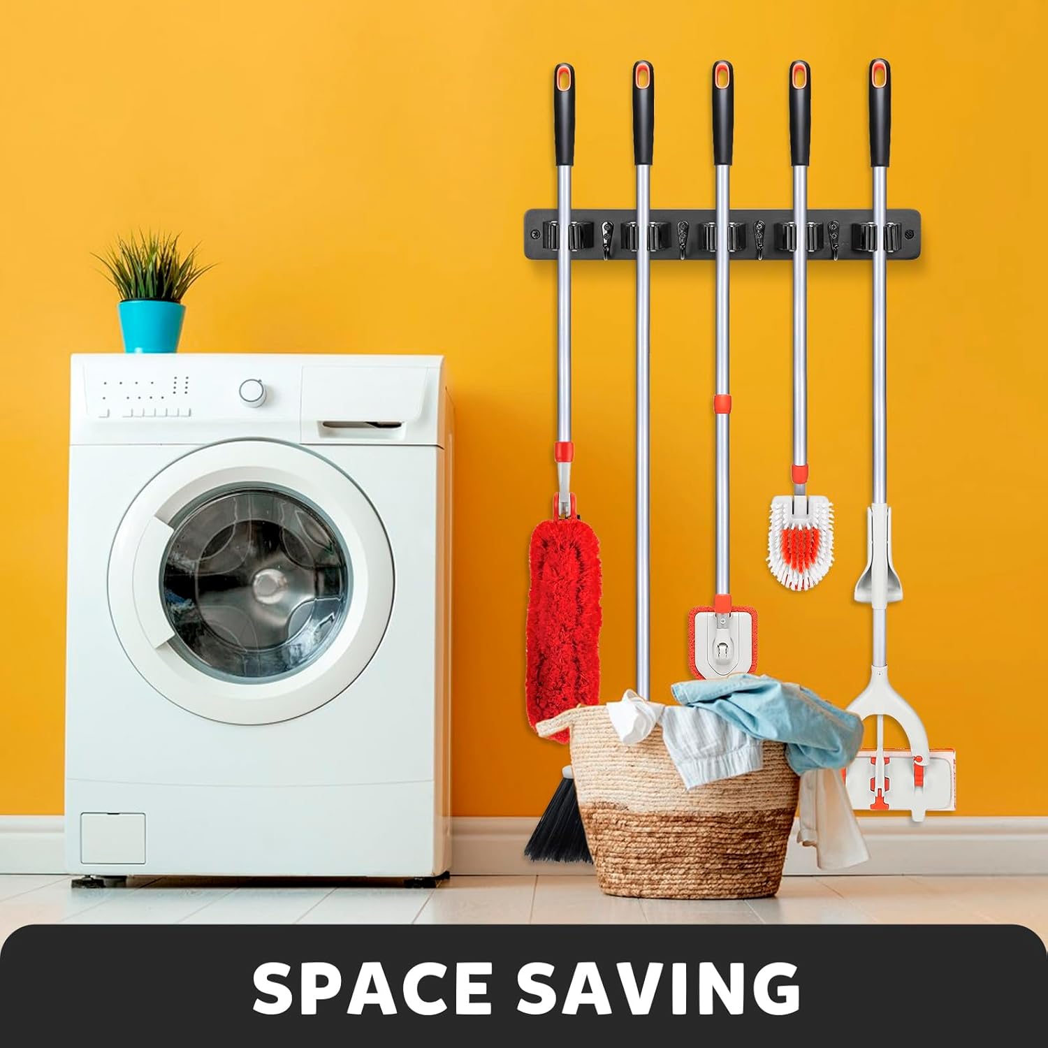 - HOME ESSENTIALS: Broom hanger is a great addition to your laundry room. Helps to keep all mops, brooms, flyswatter and anything else you have to hang all in one place. Mop holder grip everything tightly and securely without slip. Much better way to neatly store items you need for cleaning up and handy as well