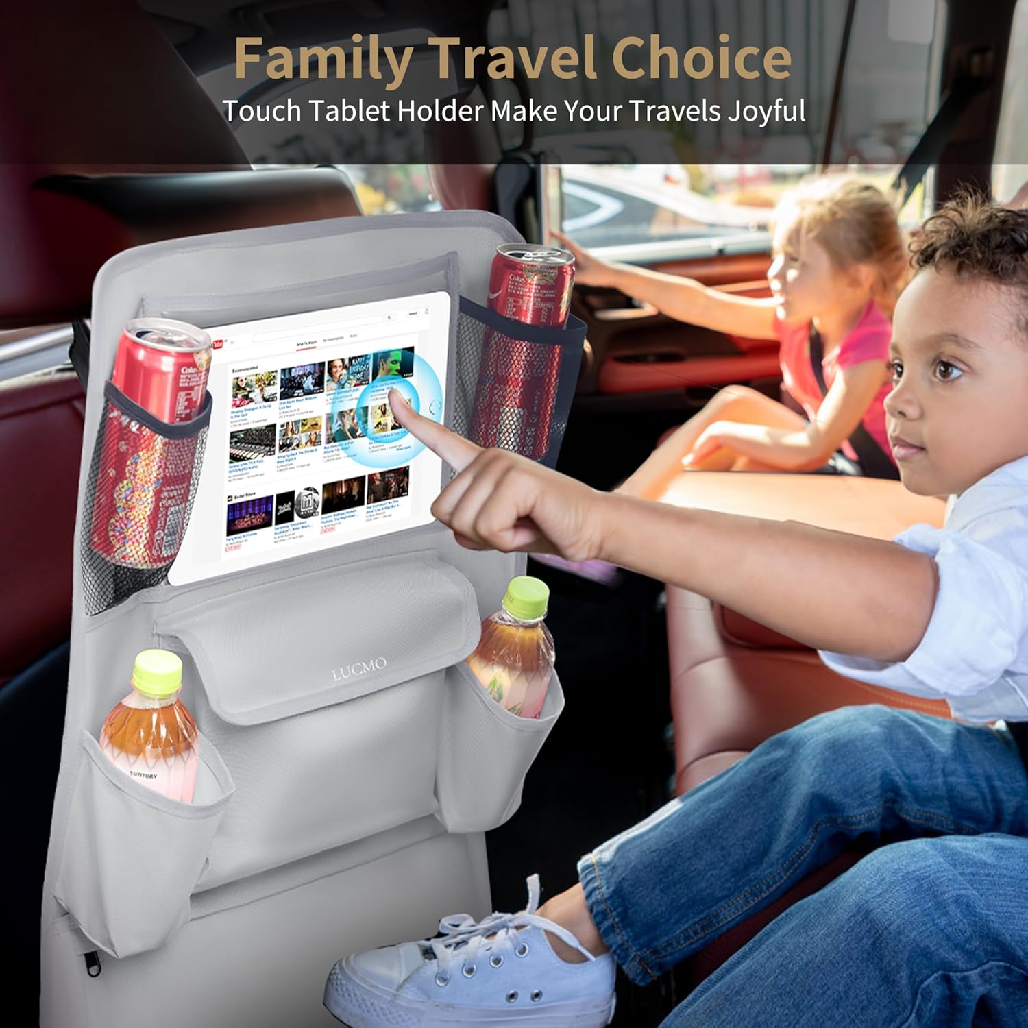 LUCMO Car Backseat Organizer with Touch Screen Tablet Holder,9 Storage Pockets Car Storage Organizer,Protectors Kick Mats Travel Accessories for Kids-Grey