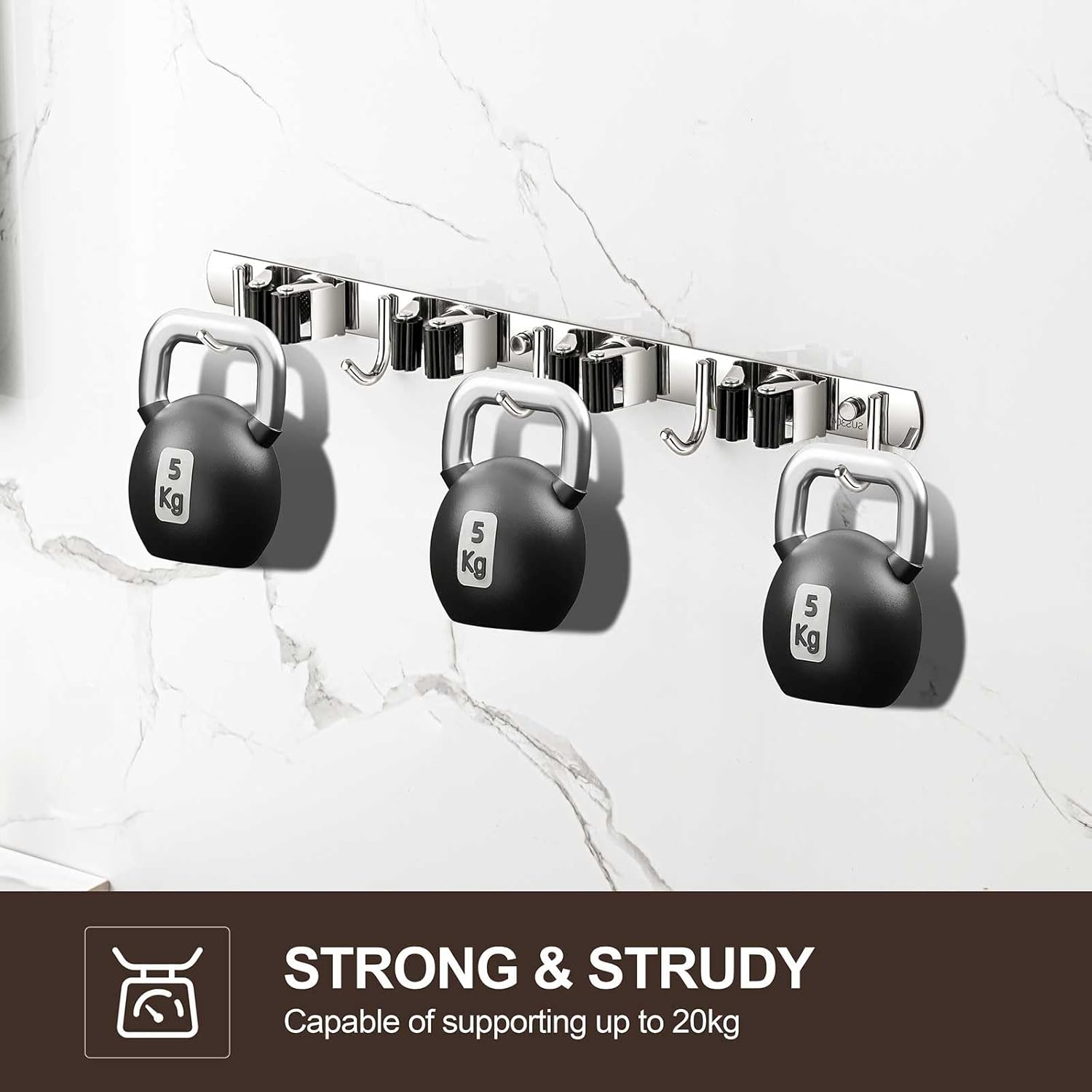 - STURDY & NON-SLIP DESIGN: Our broom and mop holder wall mount is constructed from rustproof stainless steel, offering greater durability than plastic options. It can support up to 44 lbs with screws (or 22 lbs with self-adhesive). The integrated anti-slip silicone prevents scratches and ensures a strong grip, thanks to the double rubber-gripped slots.