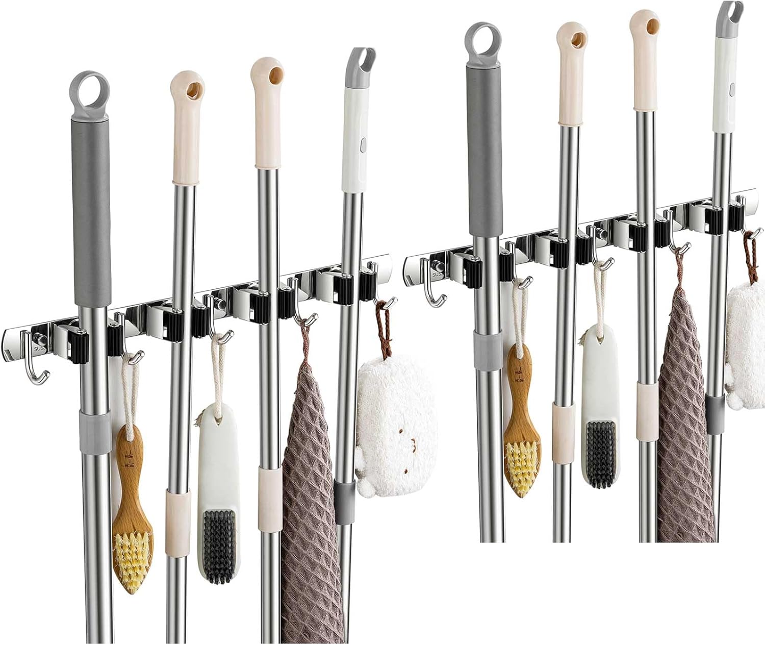 - ORGANIZE & SAVE SPACE: Featuring 4 racks and 5 hooks, this broom and mop organizer optimizes wall space, keeping your tools neatly arranged and easily accessible. It's ideal for brooms, mops, rakes, garden tools, and more, ensuring your garage, kitchen, bathroom, or laundry room stays clutter-free. The extra hooks provide additional hanging space for various items