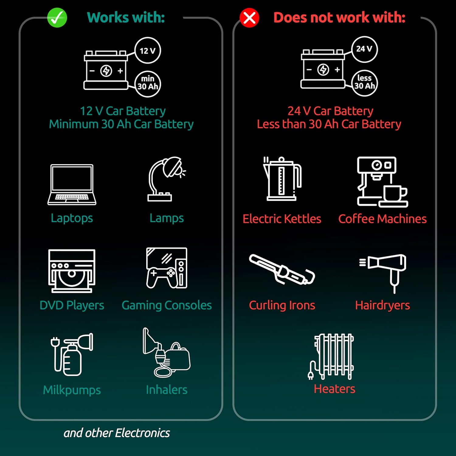 - QUIET OPERATION: Equipped with a quiet fan, this 300 watt inverter maintains optimal temperature without disturbing noise, perfect for a peaceful journey.