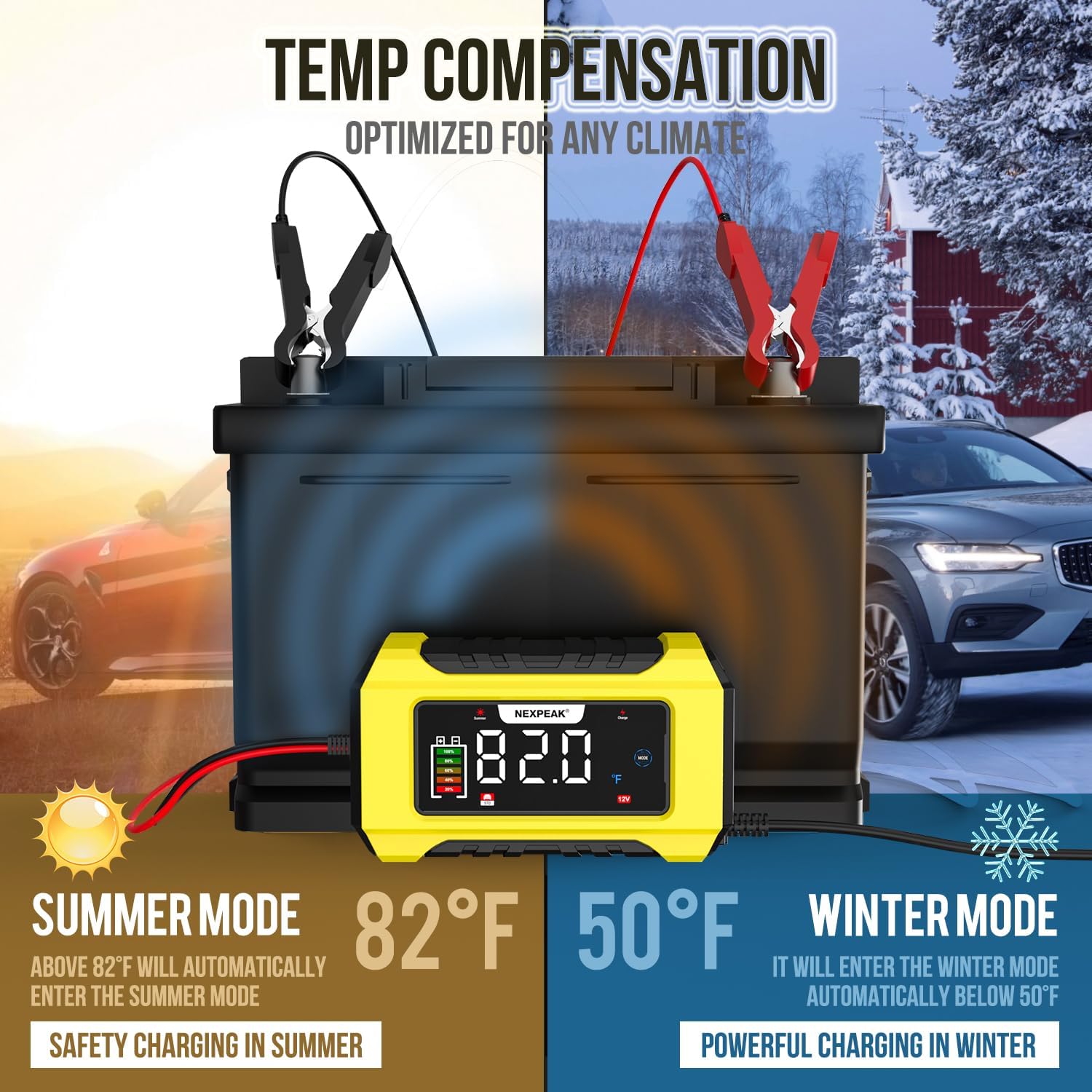- 【HIGH-EFFICIENCY PULSE REPAIR】battery charger automotive detects battery sulfation and acid stratification, takes the newest pulse repair function to restore lost battery performance for stronger engine starts and extended battery cycle life. Try to repair batteries for several hours then fully charge it you will find the difference! NOTE: can not activate or charge totally dead batteries.