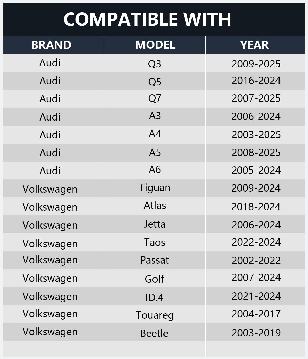 - Suitable: Compatible with Audi Q3, Q5, Q7,A3 2004-, A4 2003-, A5, A6 2005-, A8 2004-, S6, S7, TT 2007-, R8, Wolkswagen CC, Golf 2006-, Jetta 2006-, Rabbit 2005-, Passat 2001-, Beetle 2006-, Tiguan, Touareg, Polo 2001-