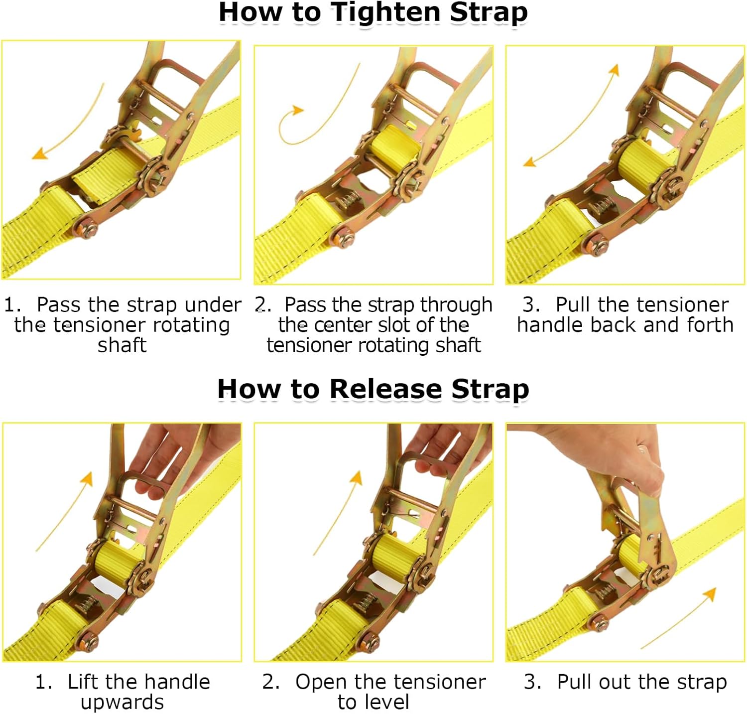 - 【Durable and Sturdy】Ratchet tie down straps heavy duty is made of metal steel and high density weaving of high quality polyester webbing fiber, features wear-resistance, corrosion-resistance, won't curl and superior breaking resistance. Super soft, does not hurt the goods. Release mechanism adpot steel heat treatment, has high hardness, not easy to rust and bend.