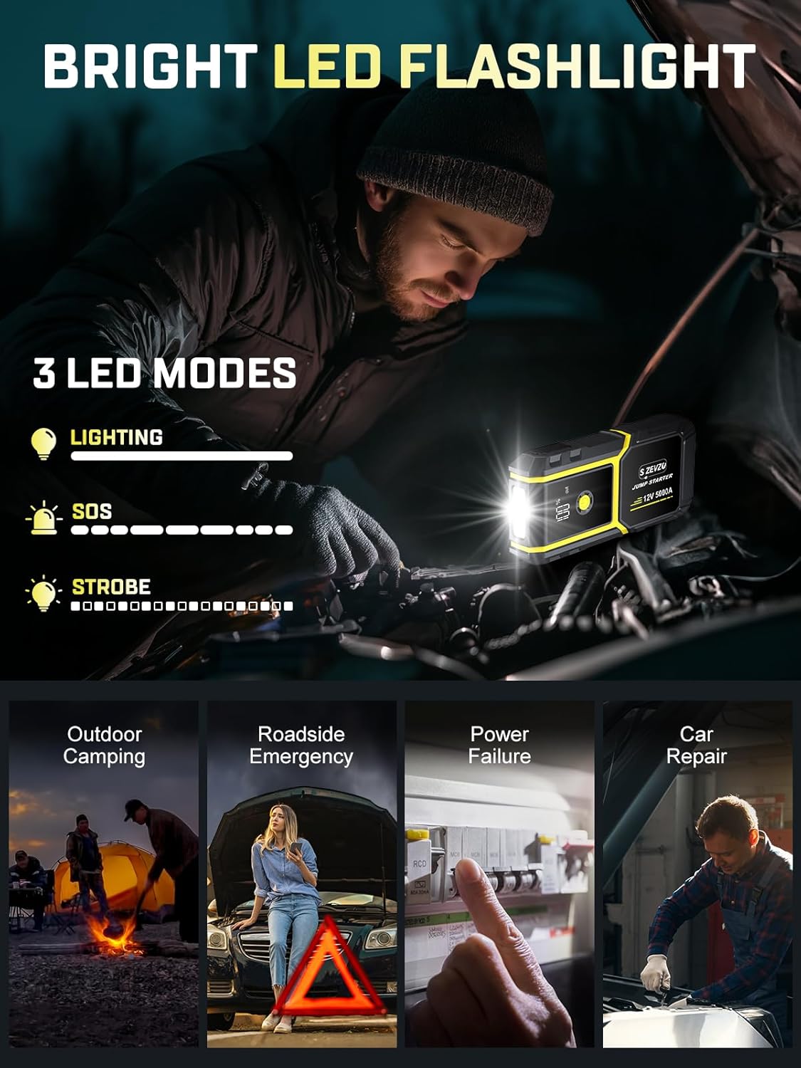 - Versatile Jump Starter WIith Bonus Features: This H021 car jump starter can work as a 500-lume LED flashlight to provide light in darkness or other emergencies with three choosable light modes( stable, strobe, and SOS). More features are accessible on this jump starter such as a Type-C input charging port, 24 months long standby time, dustproof and water-resistant, and a working temperature from -4℉ to 140℉.