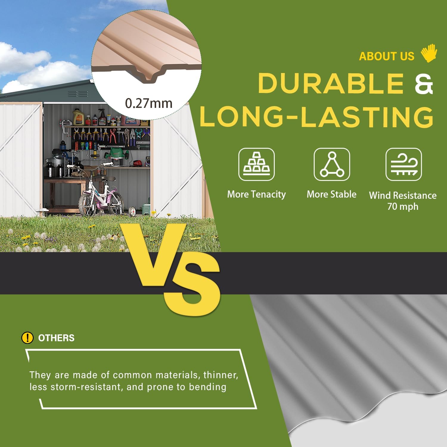 - Durable Design: Our utility shed is built to last, featuring thickened galvanized steel panels for enhanced strength and weather resistance. It includes a secure metal locking system with keys and top-quality lockable doors to keep your belongings safe.
