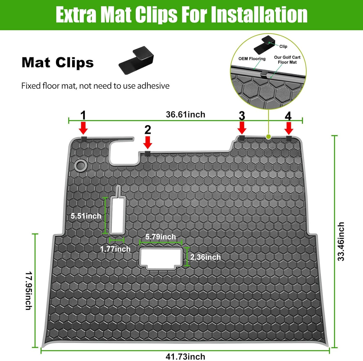- Accurate size: Laser-measured, EZGO floor mat fits around pedals and seat base, does not interfere with brake pedal and accelerator, just use four clips that attach to the factory installed mat, not need to use adhesive to stay in place, easy to install and remove
